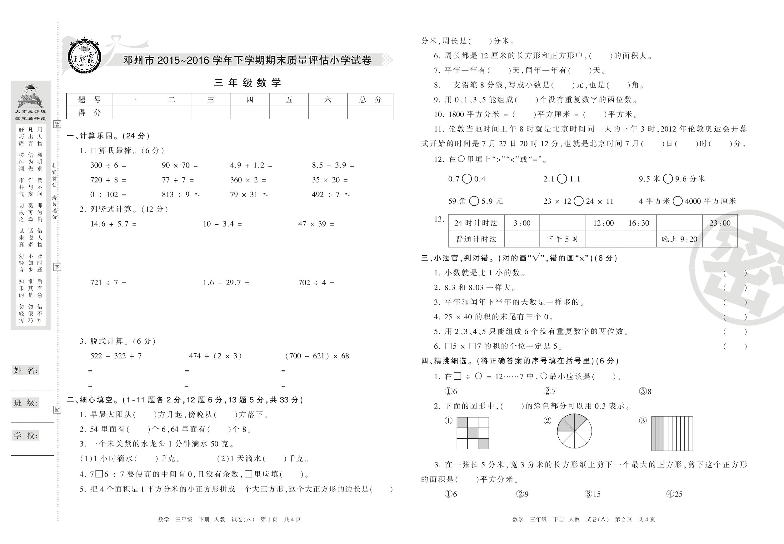 2015-2016学年第二学期邓州市三年级数学试卷(人教版)【8】