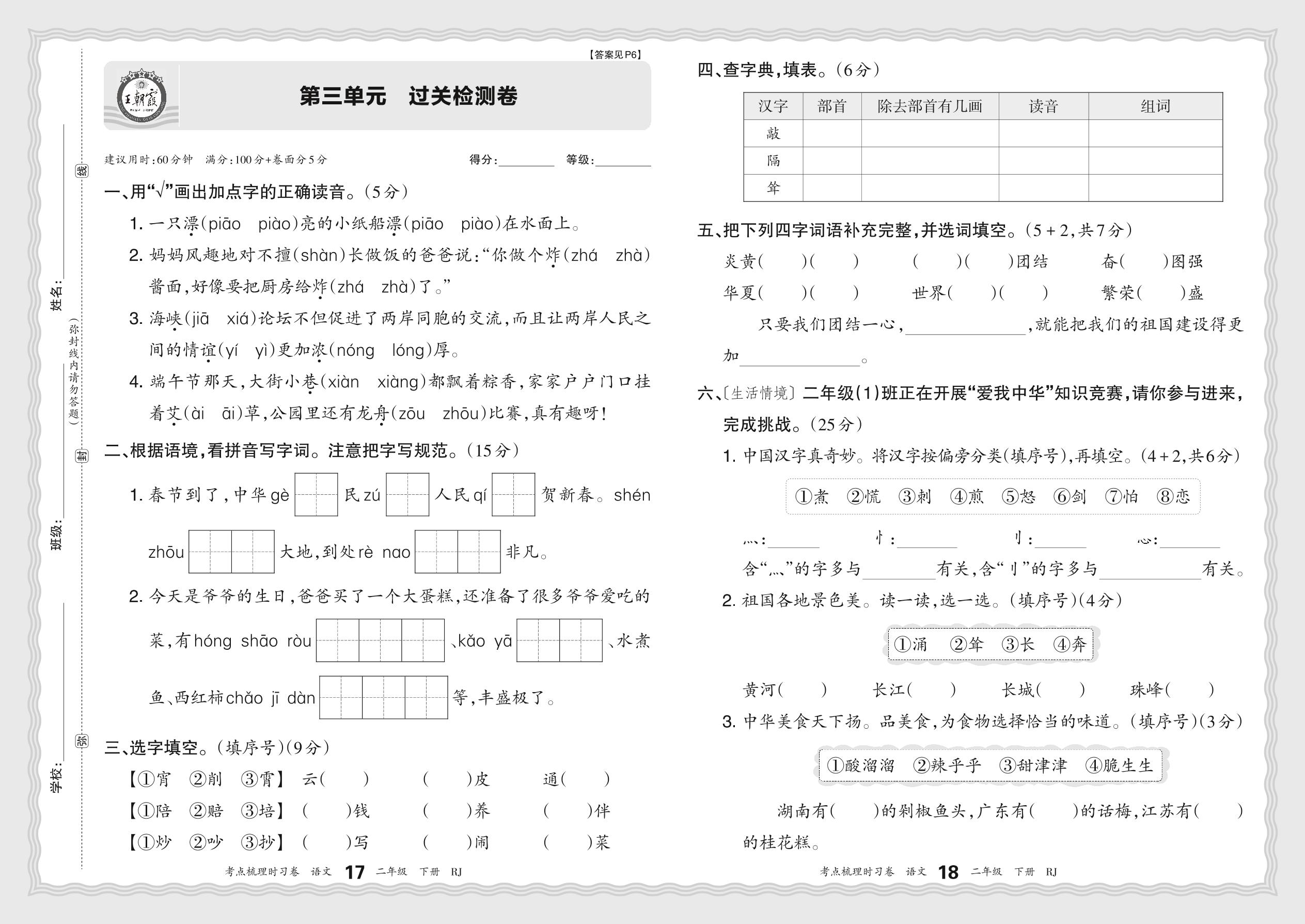2024春下册二年级语文人教版 第三单元 过关检测卷
