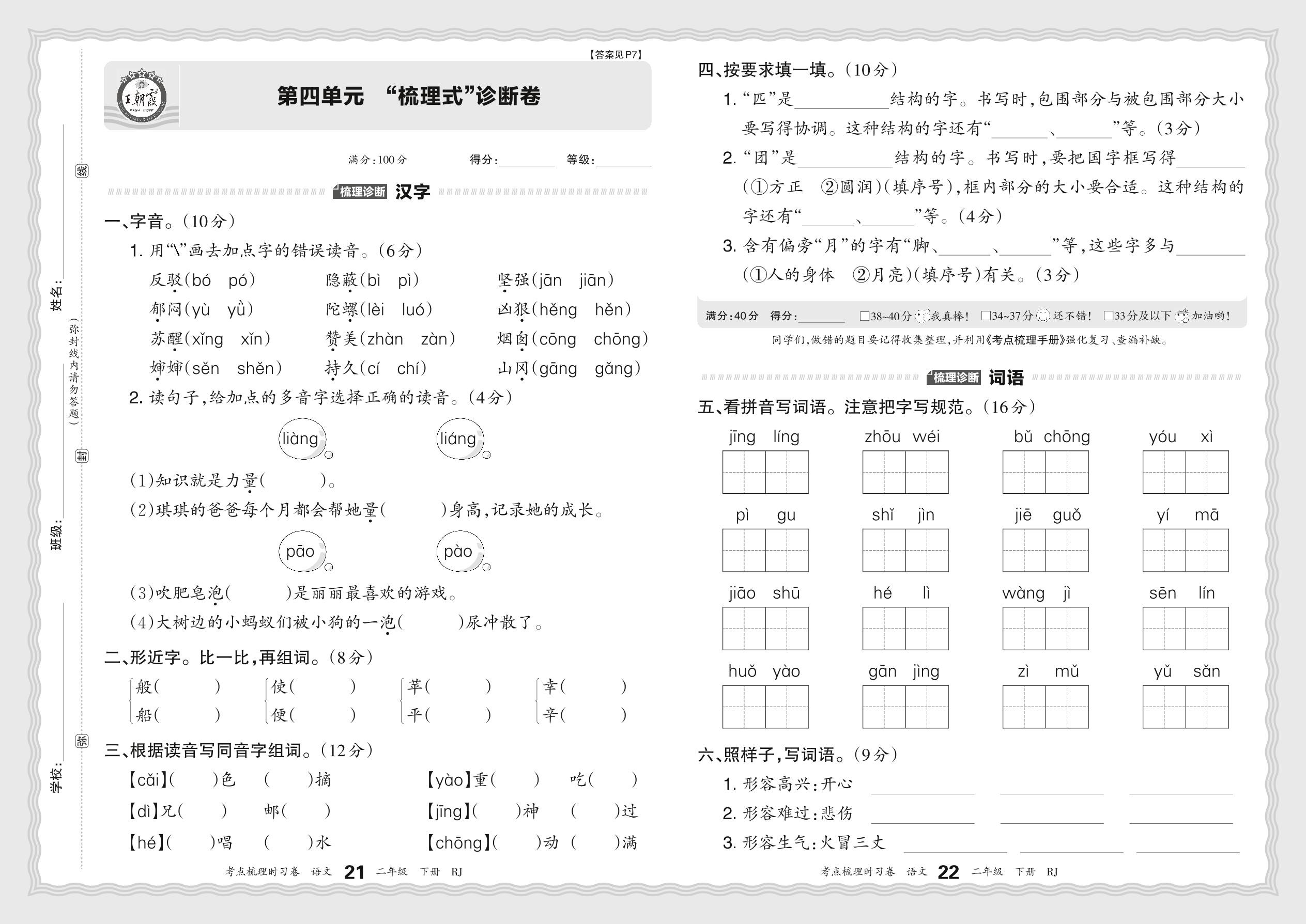 2024春下册二年级语文人教版 第四单元 “梳理式”诊断卷