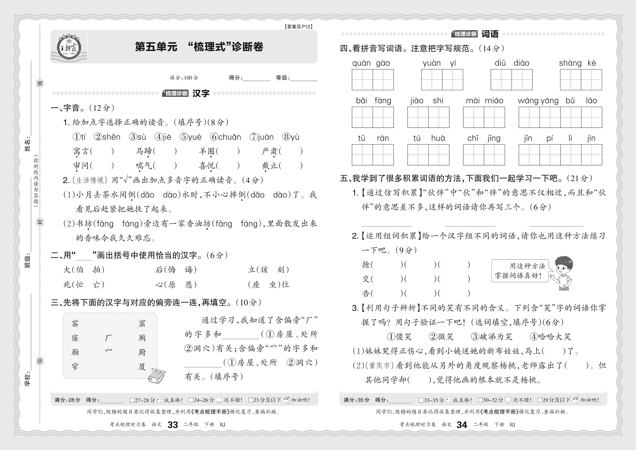 2024春下册二年级语文人教版 第五单元 “梳理式”诊断卷