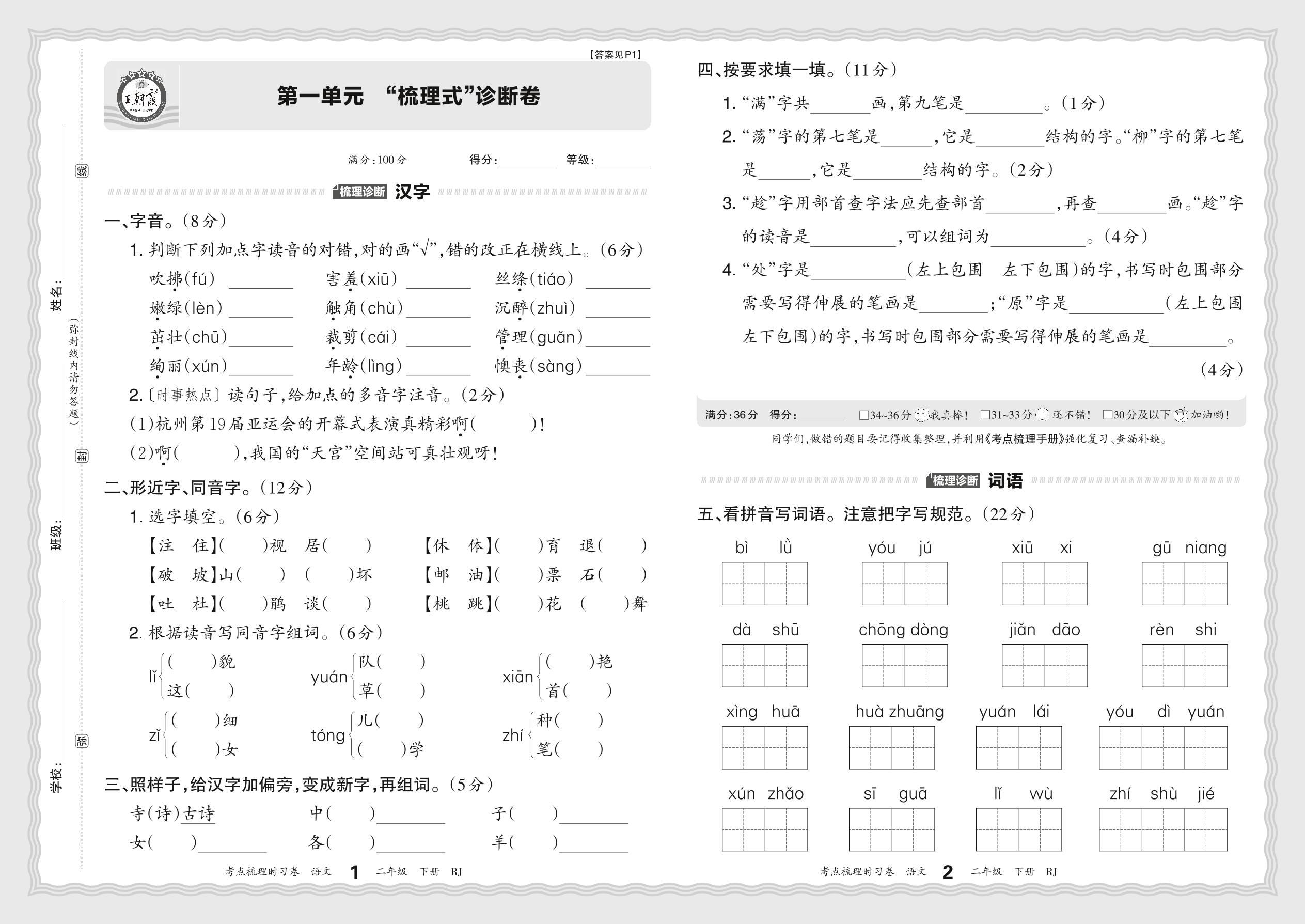 2024春下册二年级语文人教版 第一单元 “梳理式”诊断卷