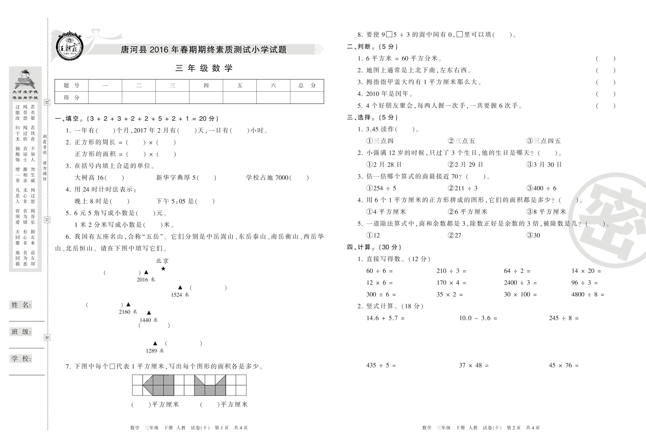 2015-2016学年第二学期南阳市唐河县三年级数学试卷(人教版)【10】