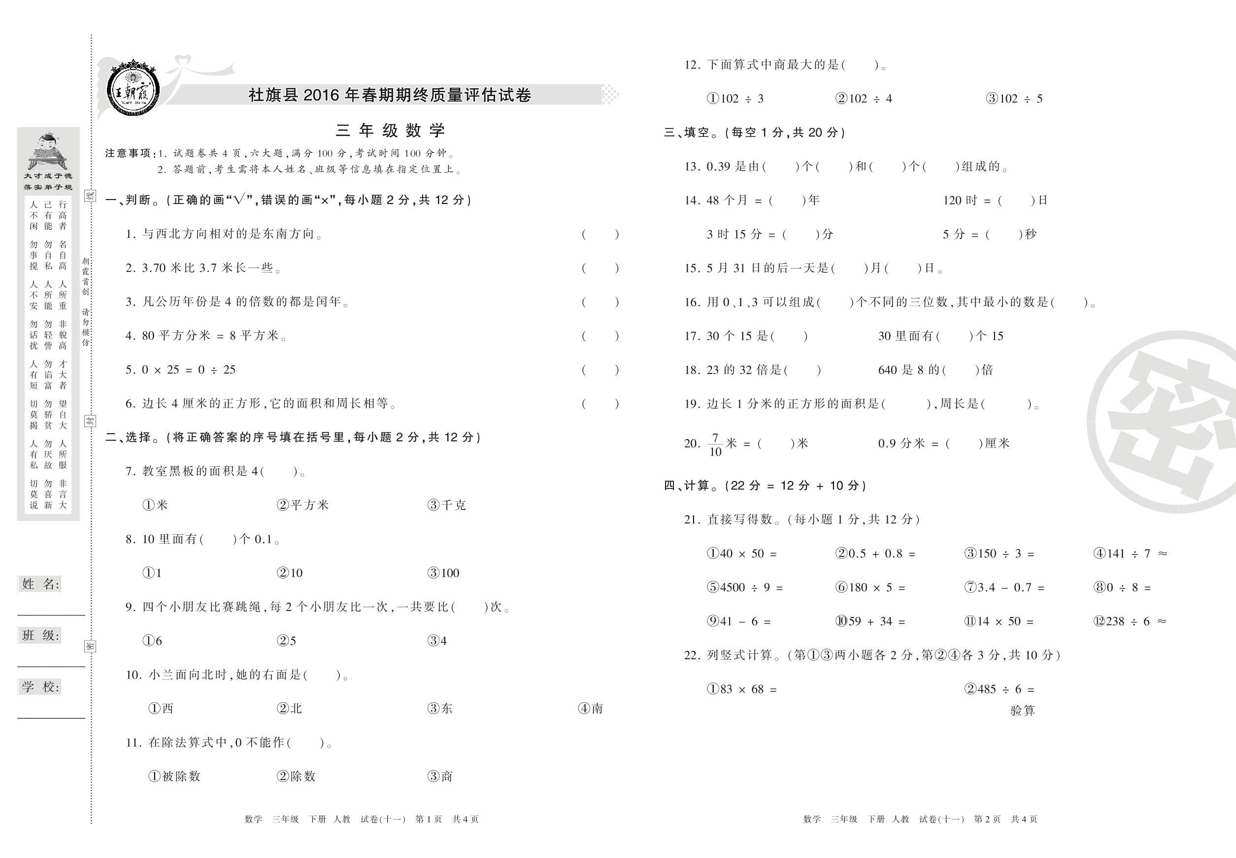 2015-2016学年第二学期南阳市社旗县三年级数学试卷(人教版)【11】