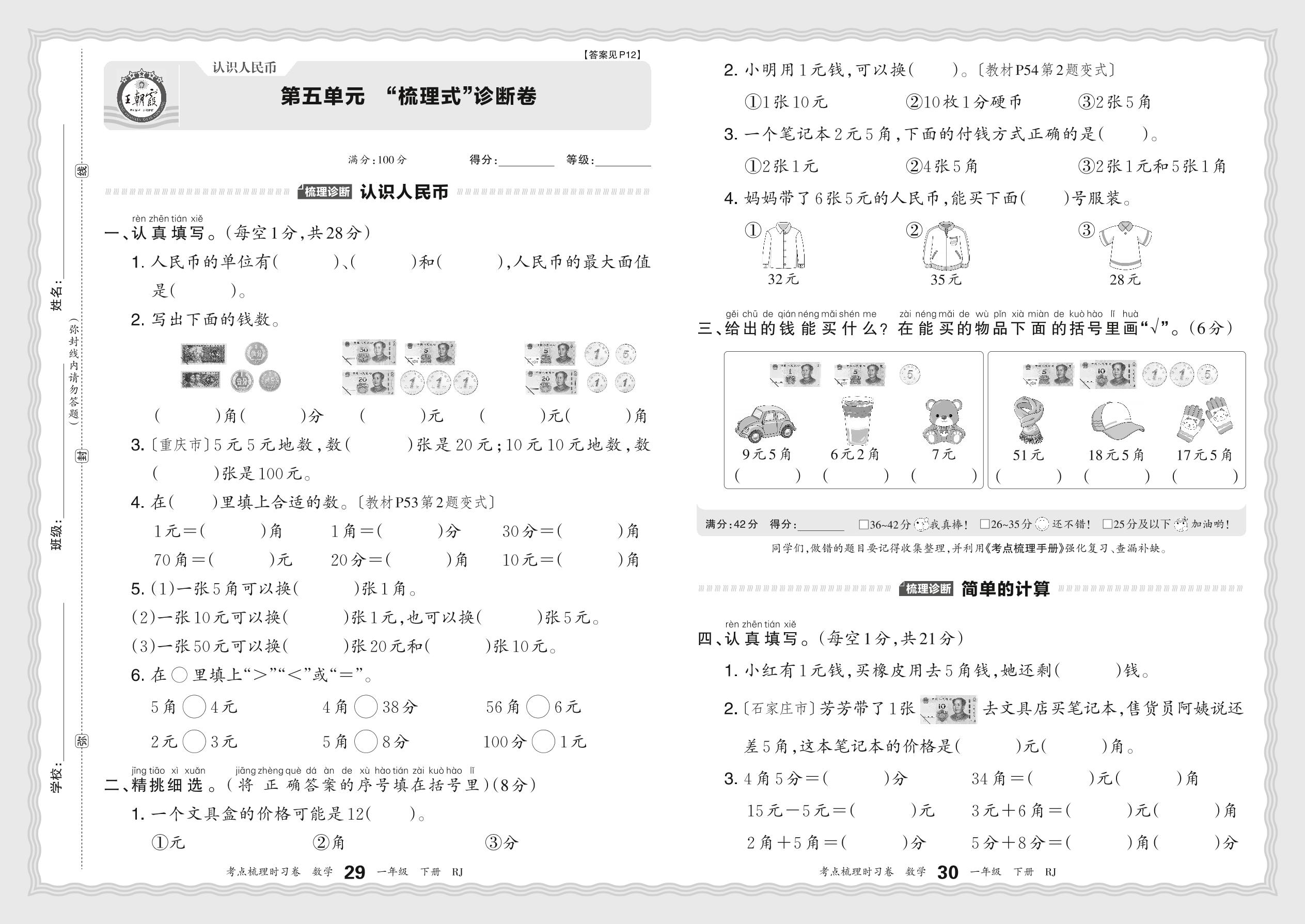 一年级数学人教版下册单元卷