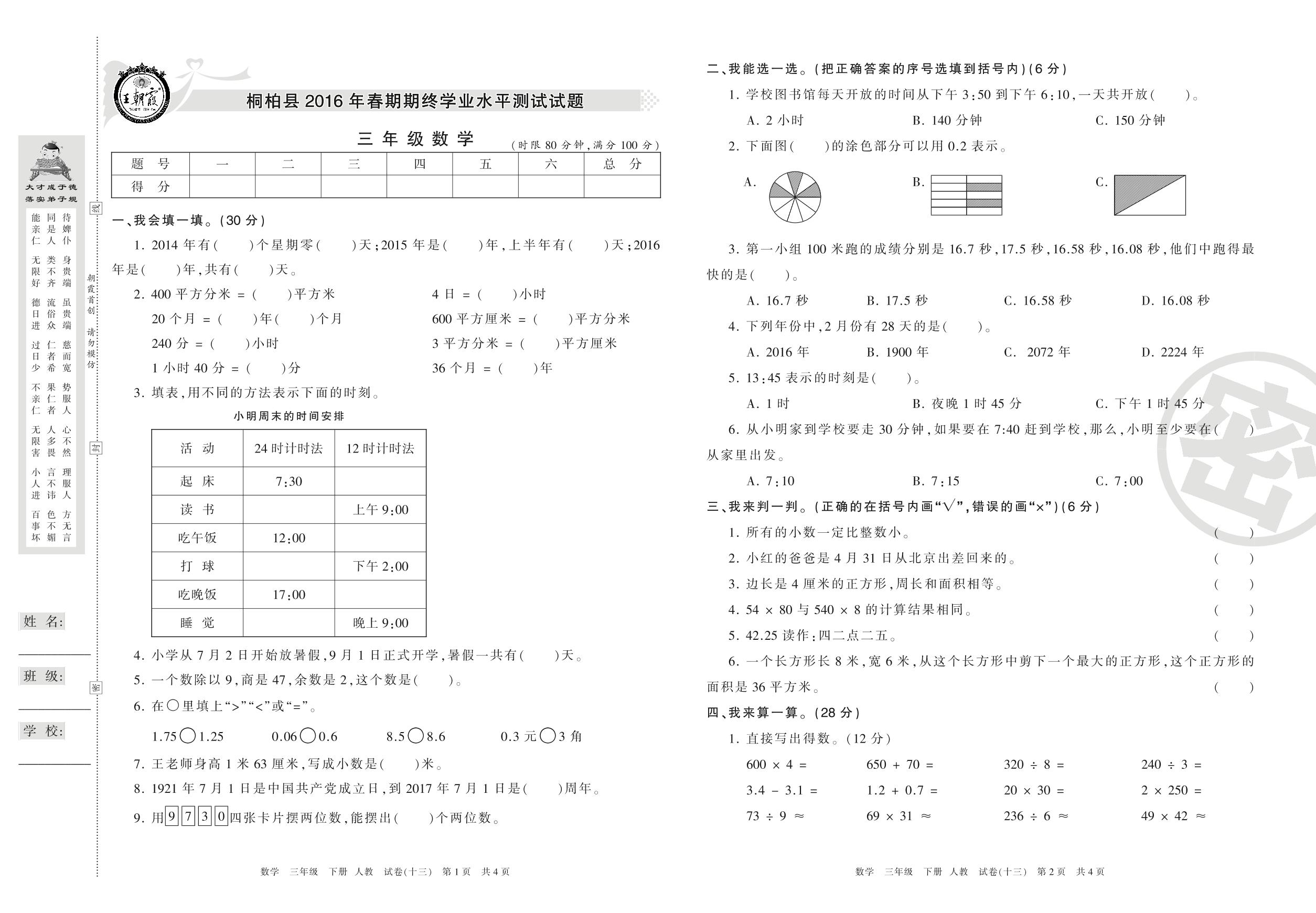 2015-2016学年第二学期南阳市桐柏县三年级数学试卷(人教版)【13】