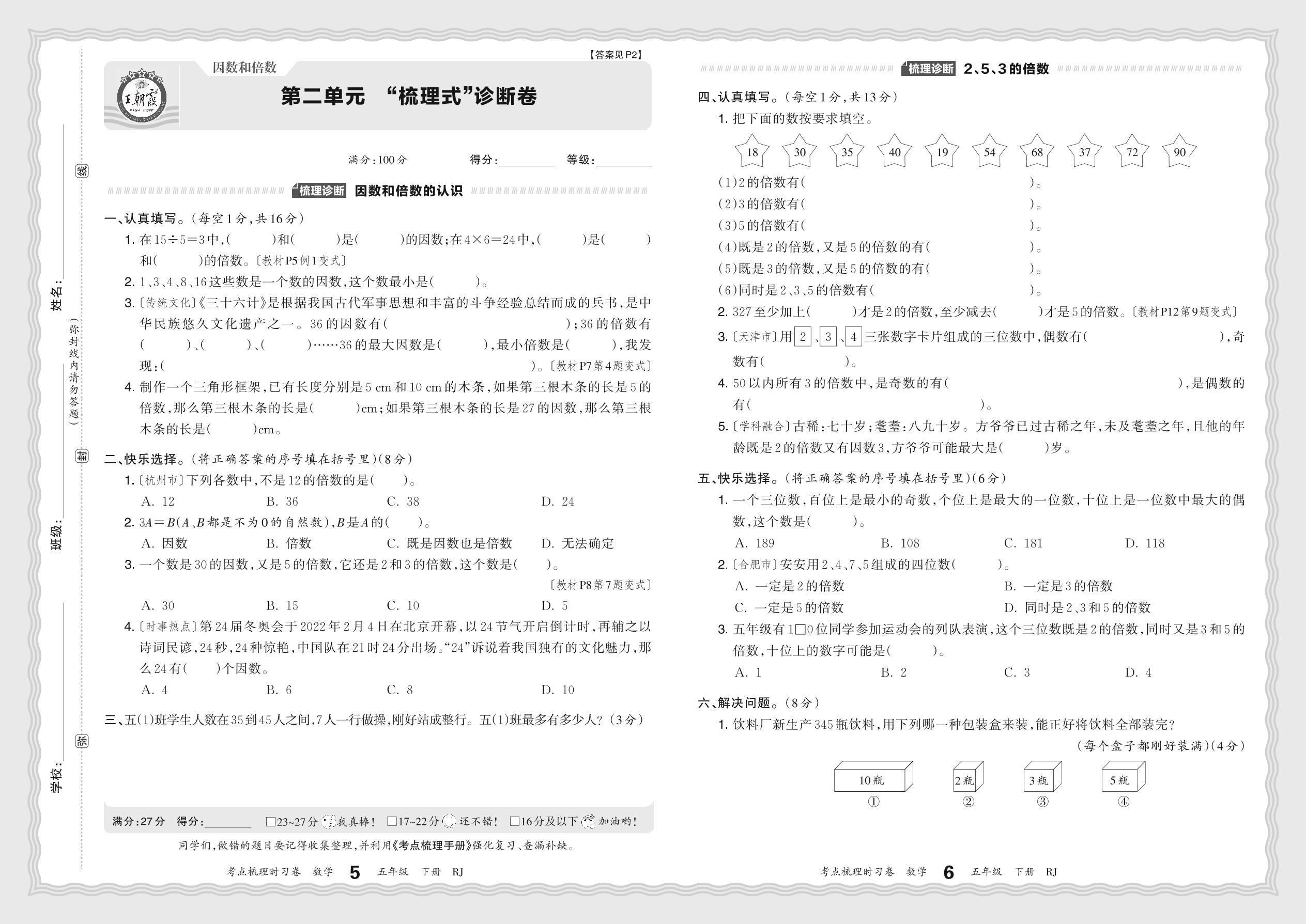 2024春下册五年级数学人教版 第二单元 “梳理式”诊断卷