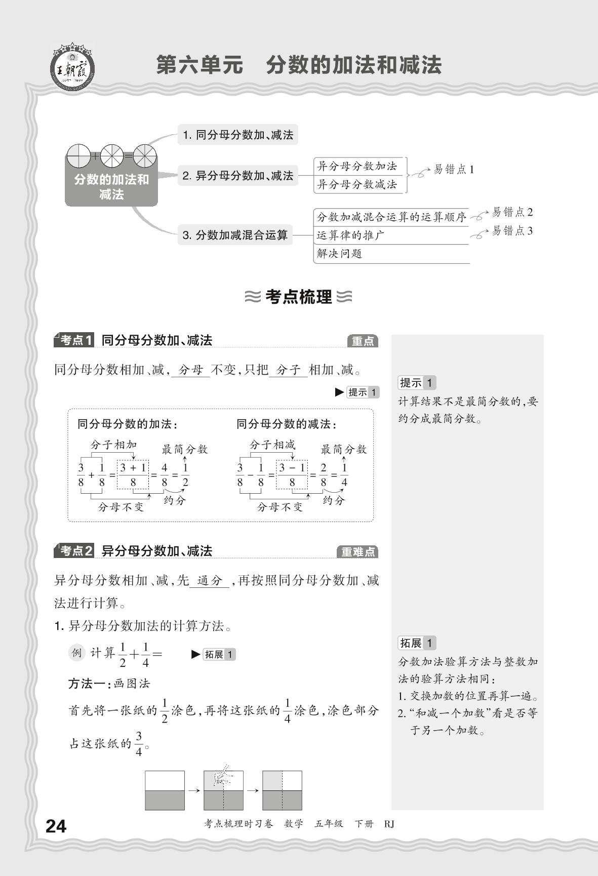 2024春下册五年级数学人教版 考点梳理手册——第六单元 分数的加法和减法