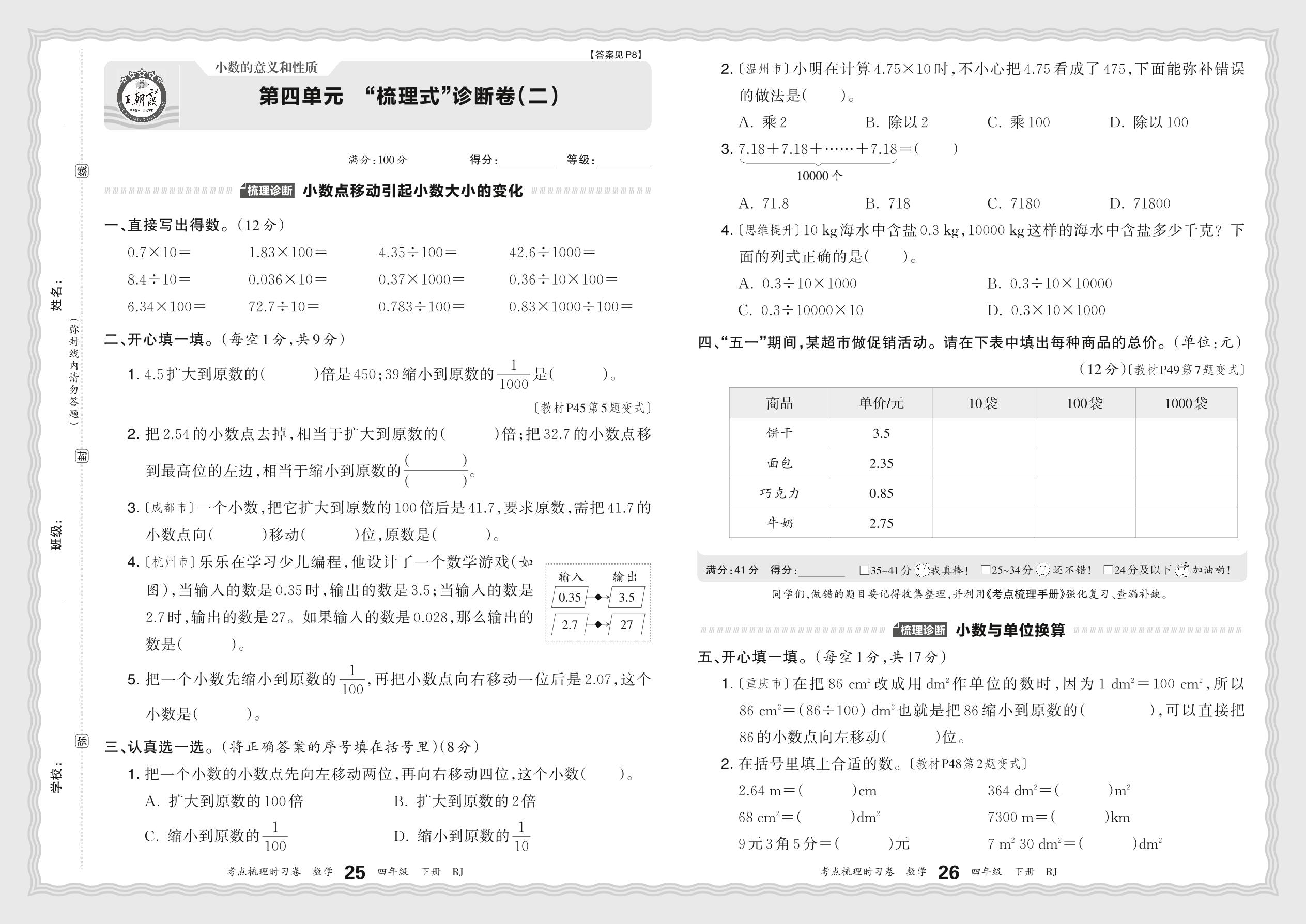2024春下册四年级数学人教版 第四单元 “梳理式“诊断卷(二)