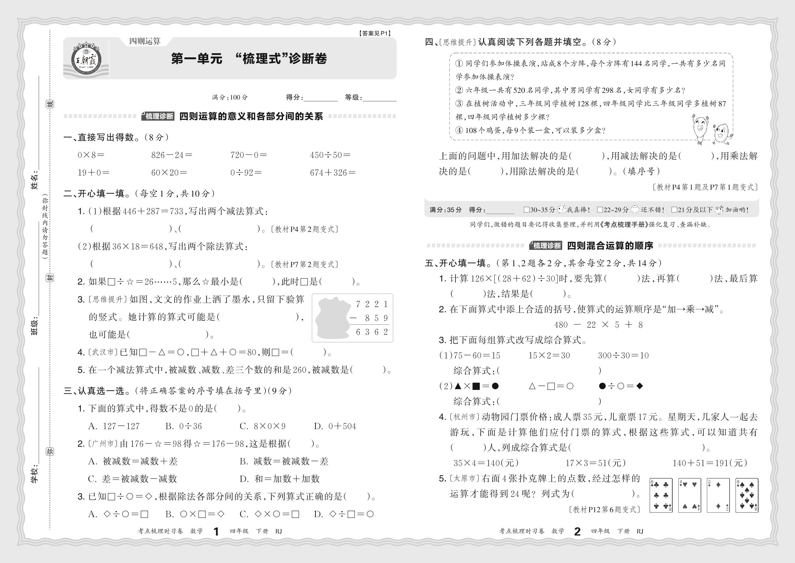 2024春下册四年级数学人教版 第一单元 “梳理式”诊断卷