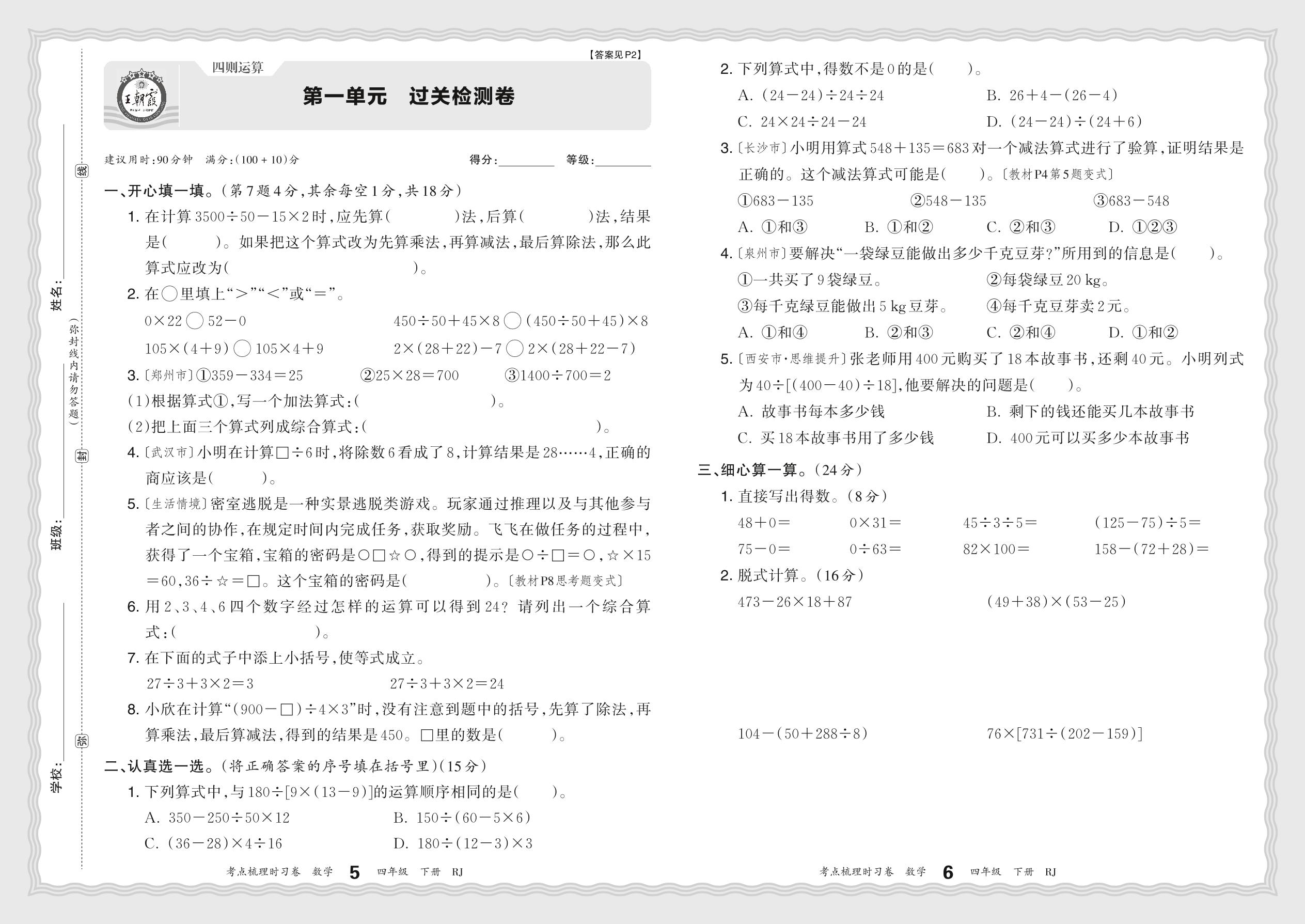 2024春下册四年级数学人教版 第一单元 过关检测卷