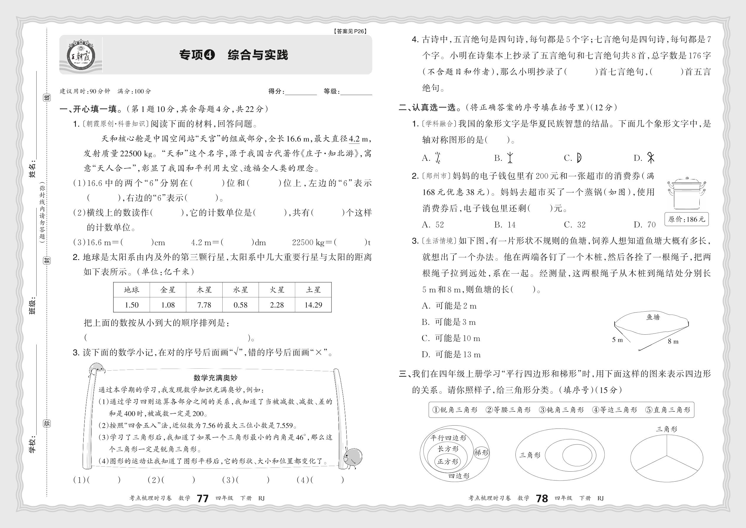 2024春下册四年级数学人教版 期末专项卷KD版·综合与实践【4】
