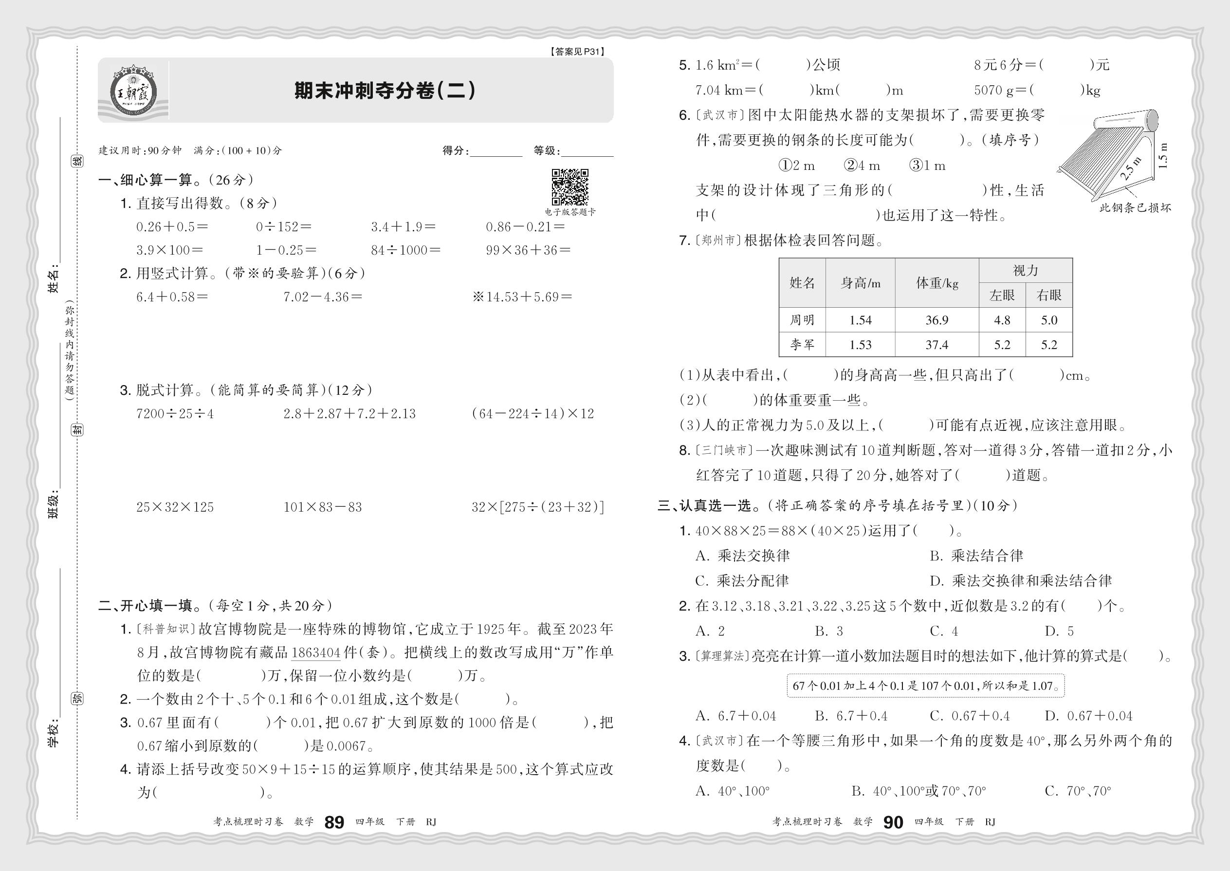 2024春下册四年级数学人教版 期末冲刺夺分卷(二)