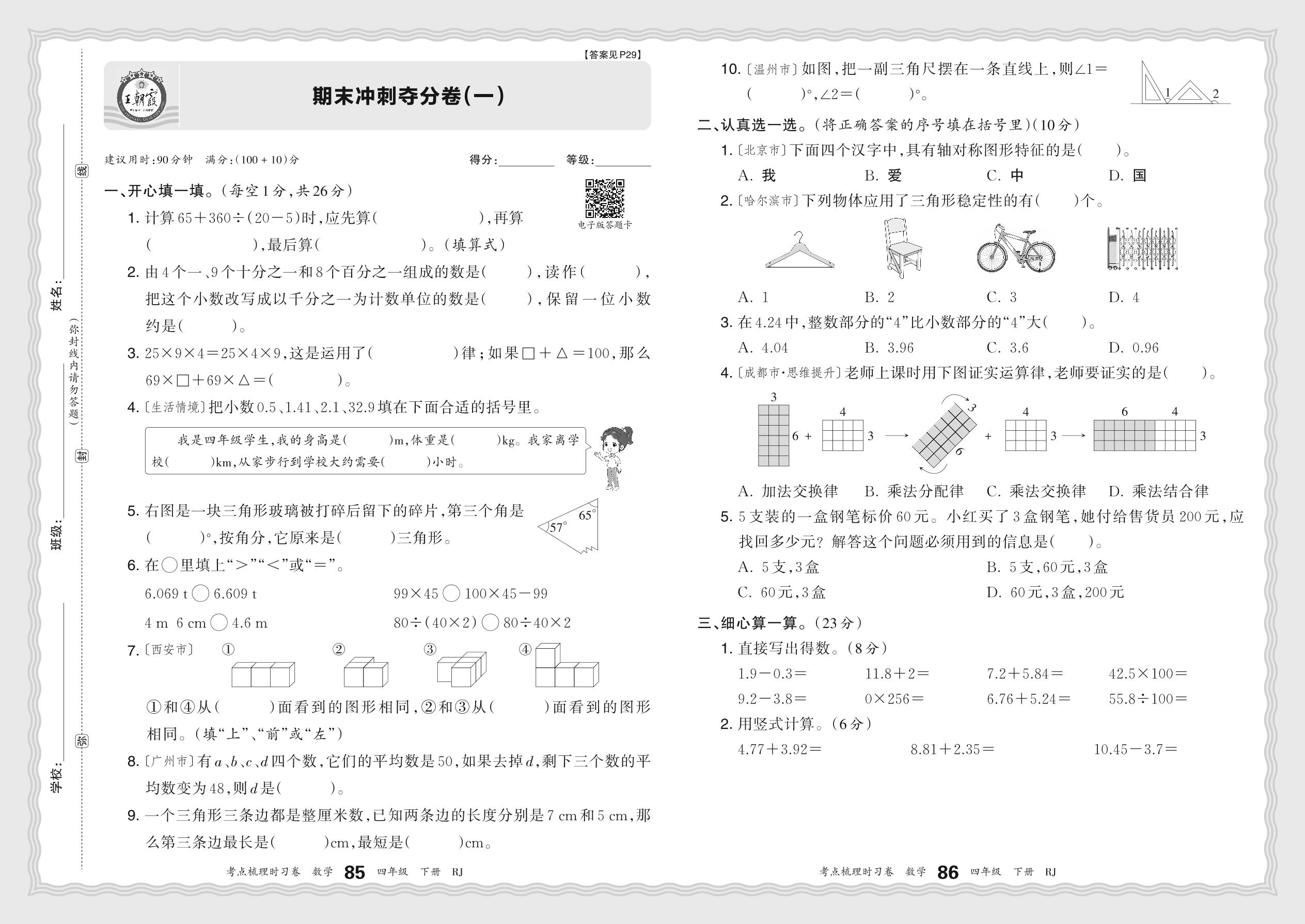2024春下册四年级数学人教版 期末冲刺夺分卷(一)