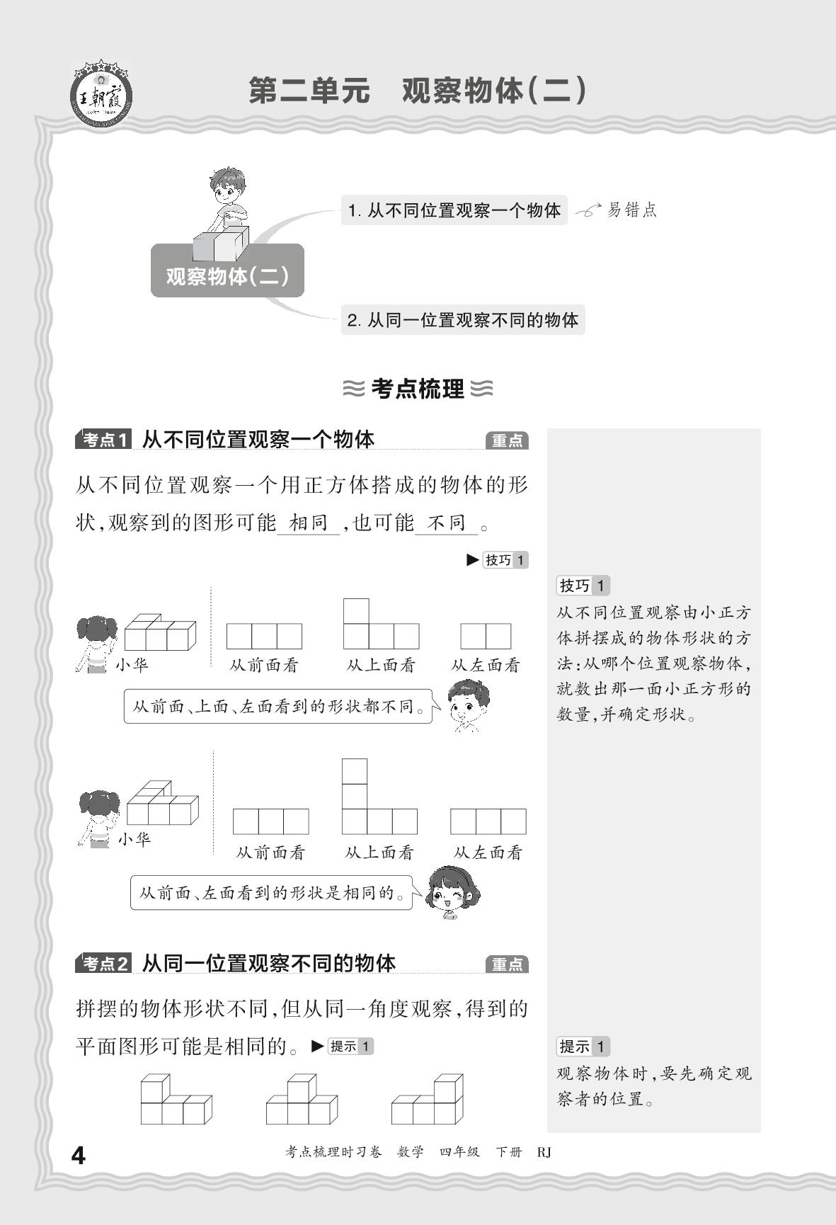 2024春下册四年级数学人教版 考点梳理手册——第二单元 观察物体(二)