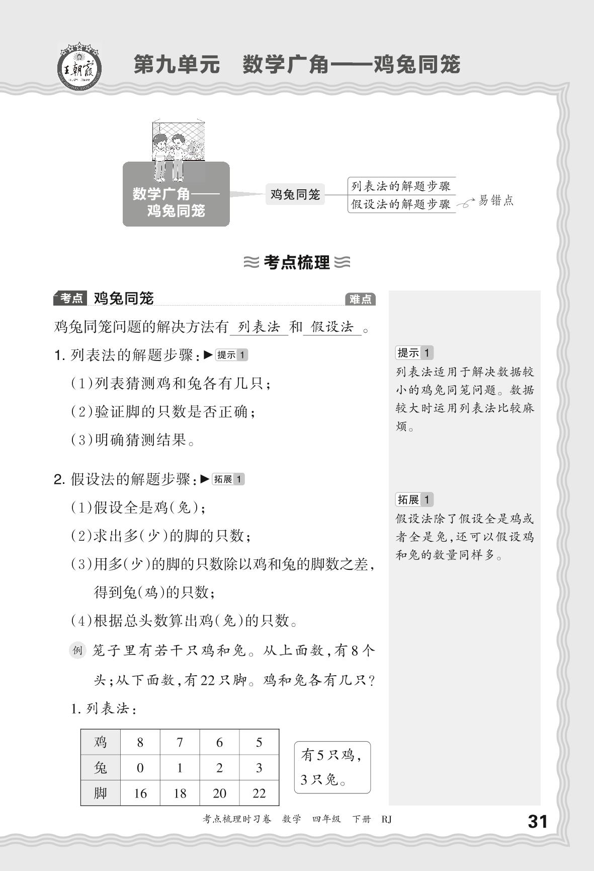 2024春下册四年级数学人教版 考点梳理手册——第九单元 数学广角 鸡兔同笼