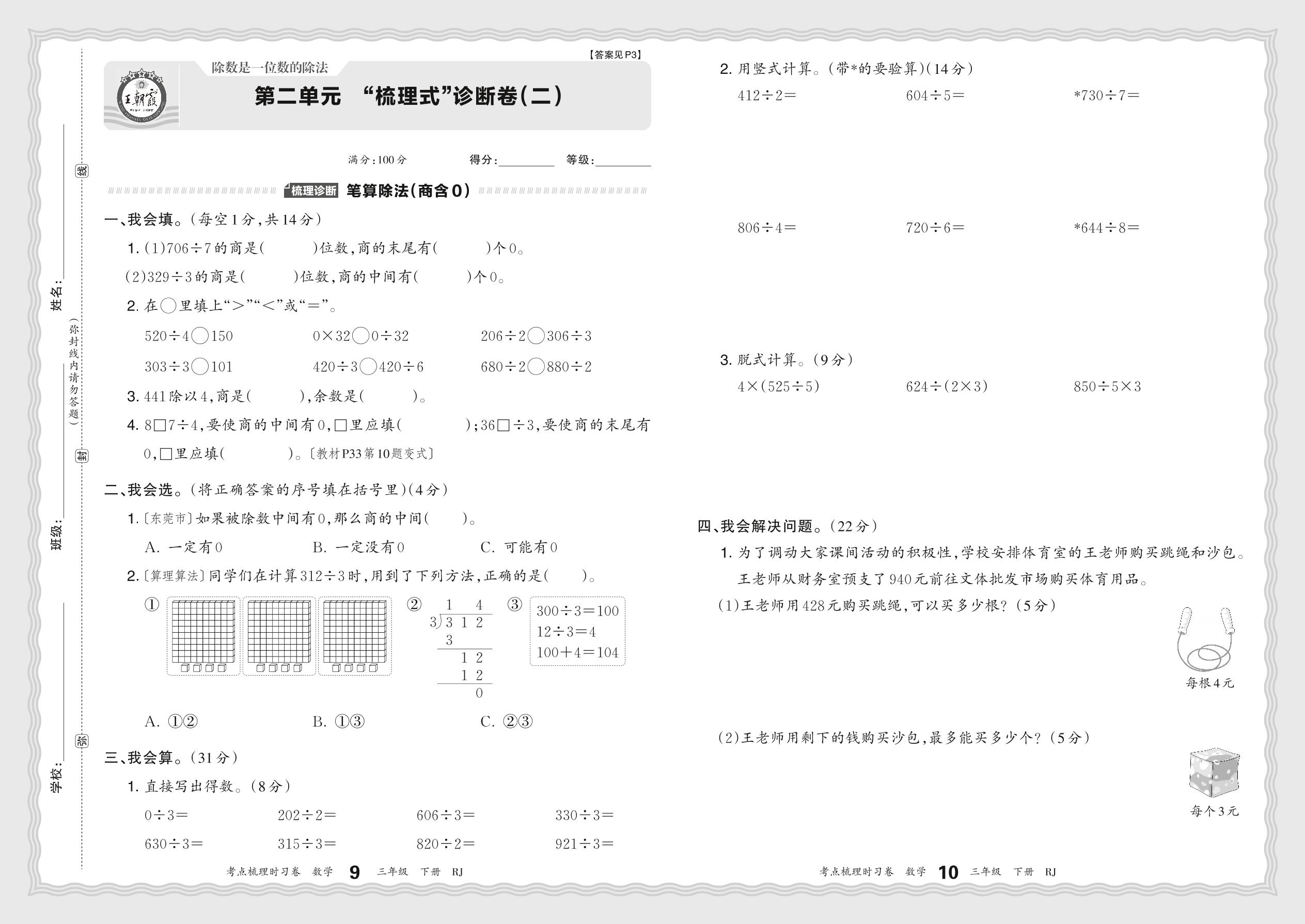 2024春下册三年级数学人教版 第二单元 “梳理式”诊断卷(二)
