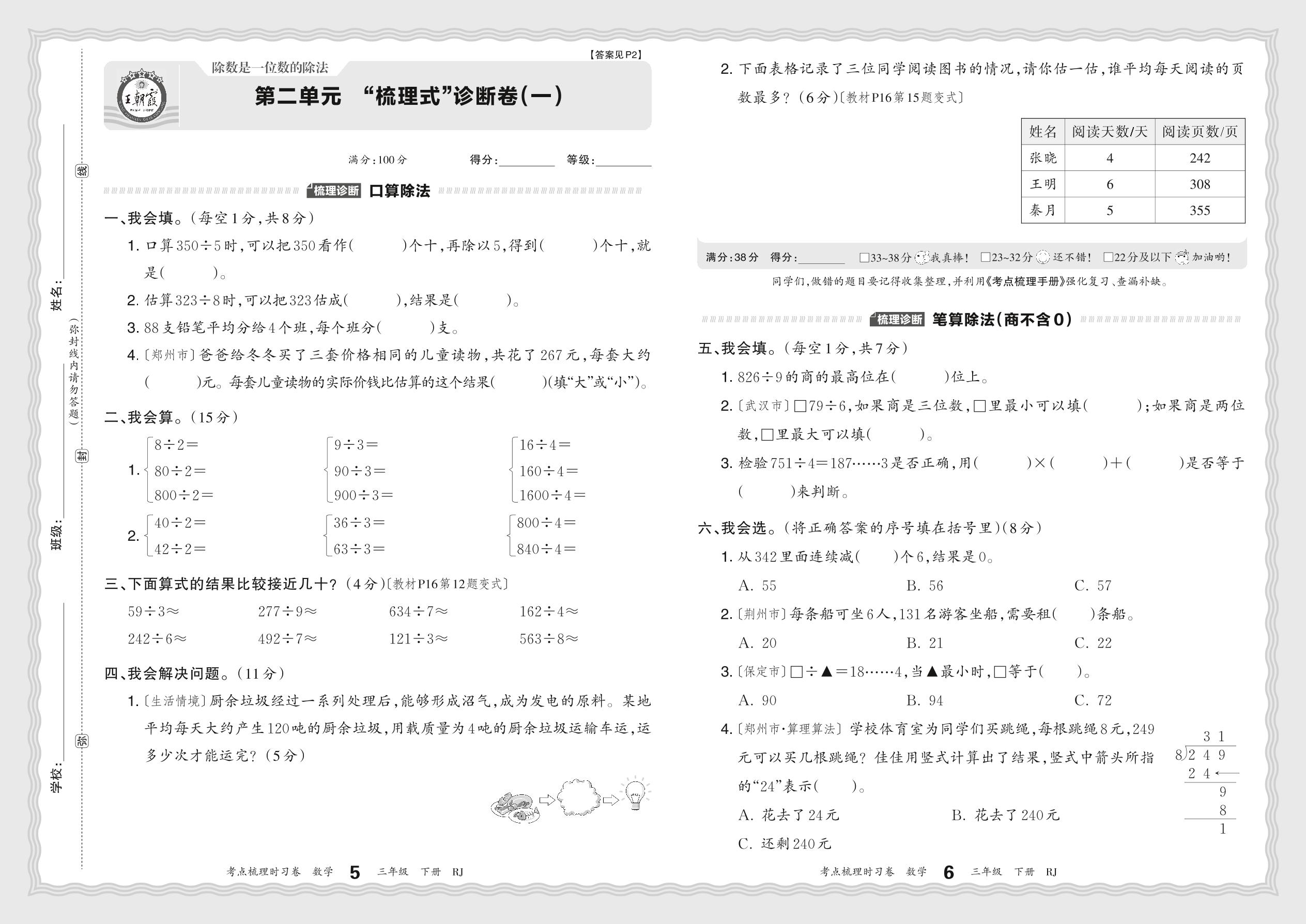 2024春下册三年级数学人教版 第二单元 “梳理式”诊断卷(一)