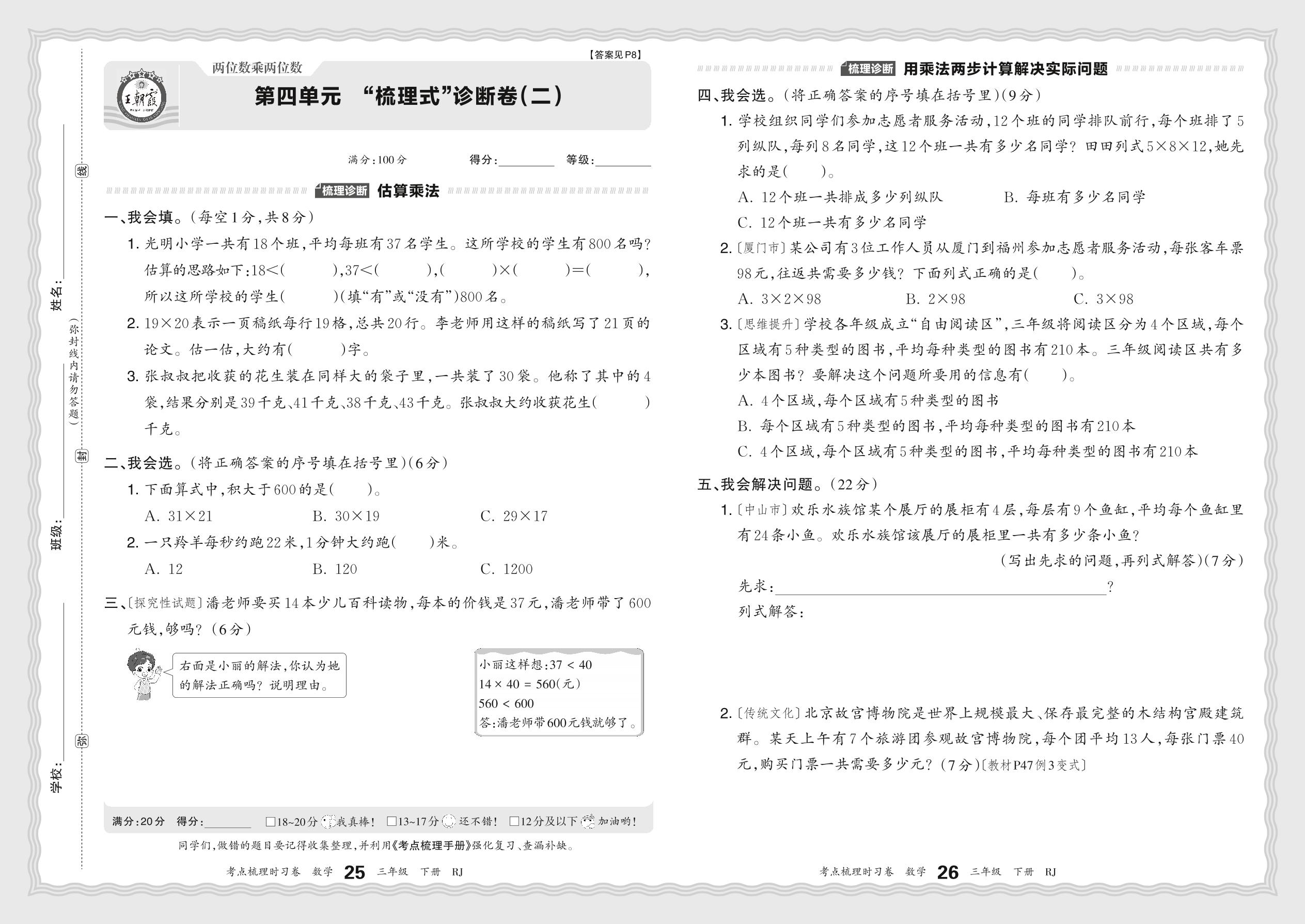 2024春下册三年级数学人教版 第四单元 “梳理式”诊断卷(二)