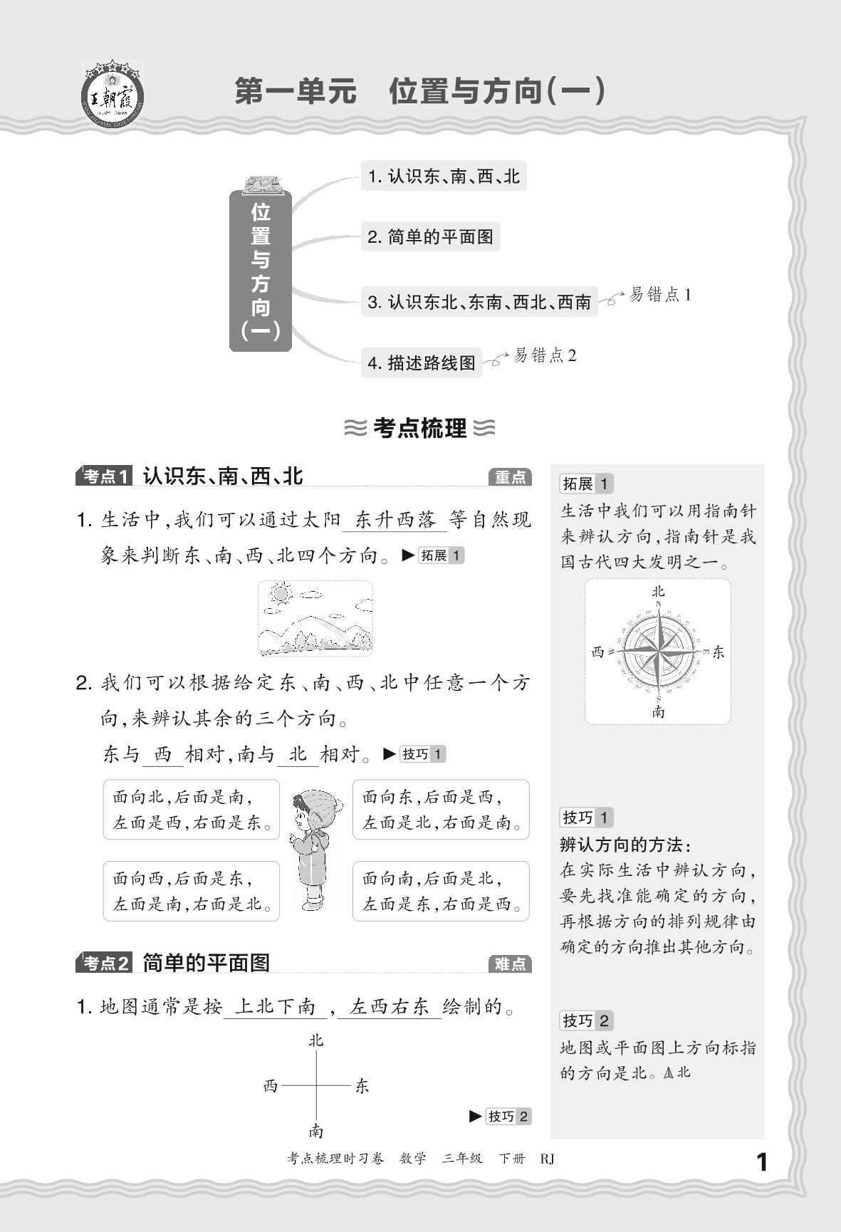 2024春下册三年级数学人教版 考点梳理手册——第一单元 位置与方向(一)