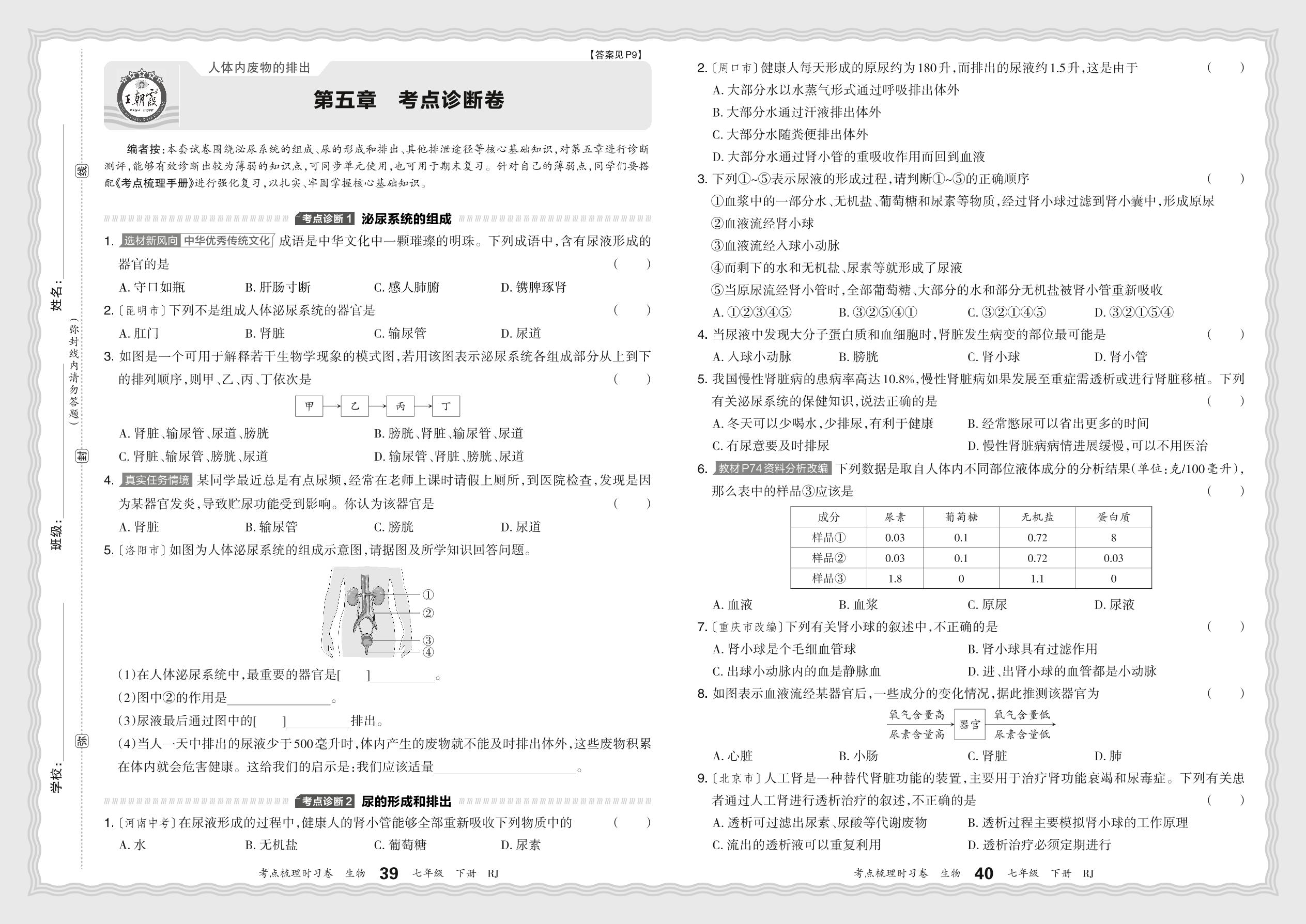 2024春下册七年级生物人教版 第五章 考点诊断卷