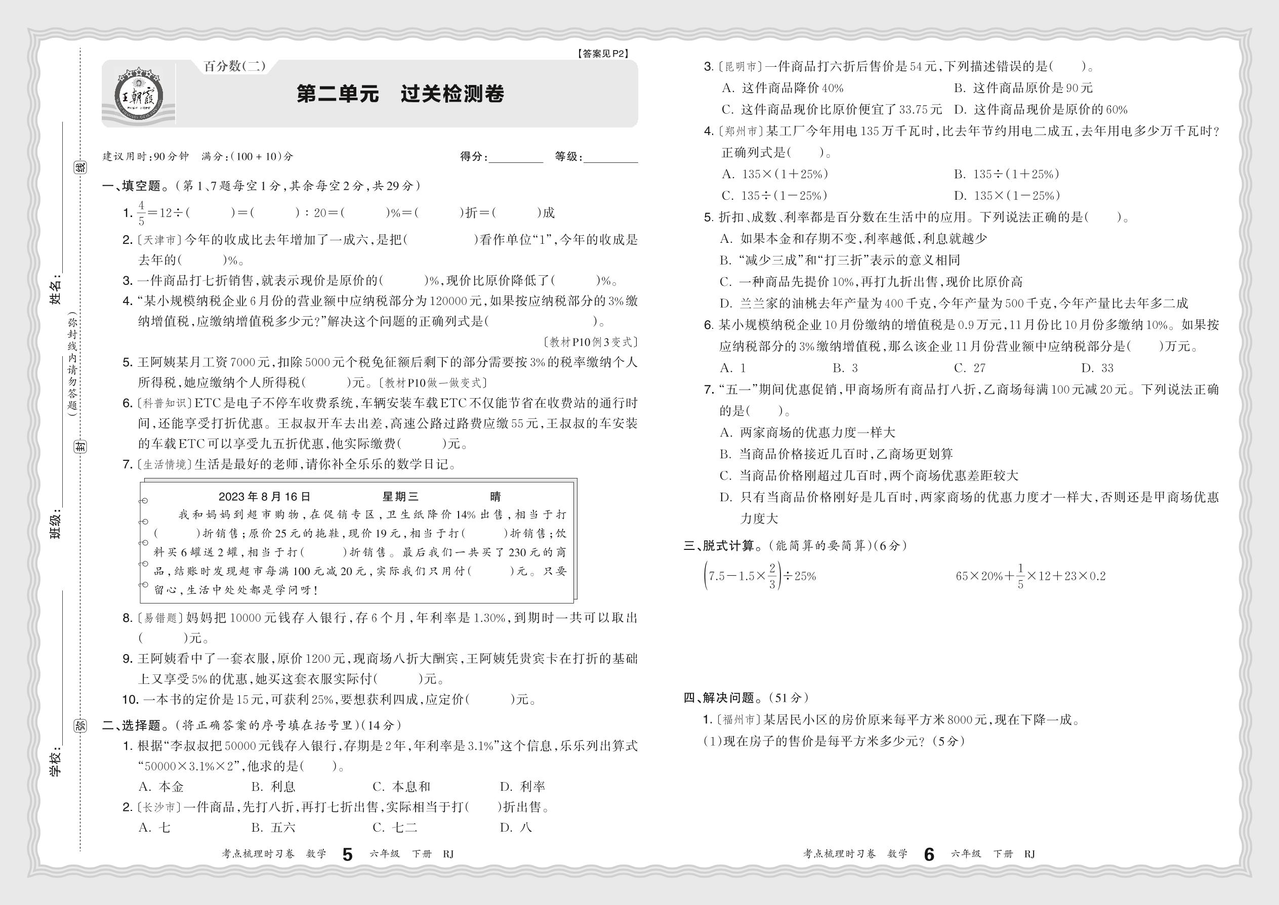 2024春下册六年级数学人教版 第二单元 过关检测卷