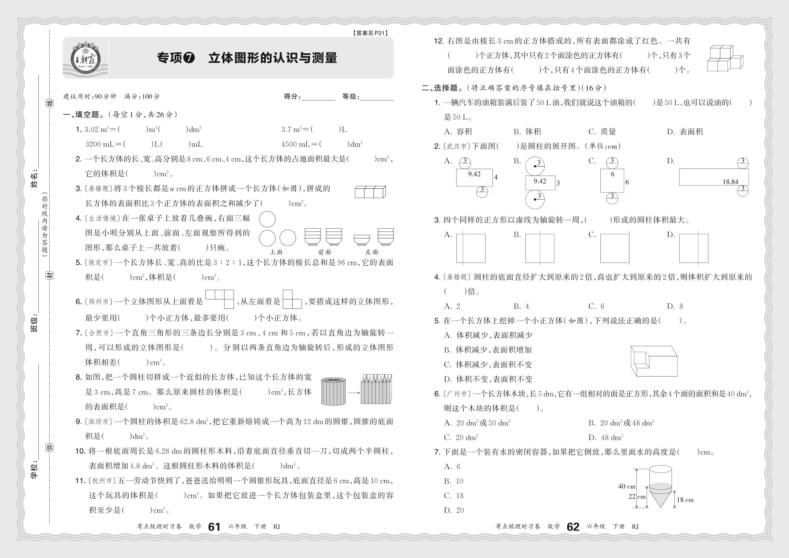 2024春下册六年级数学人教版 期末专项卷KD版·立体图形的认识与测量【7】
