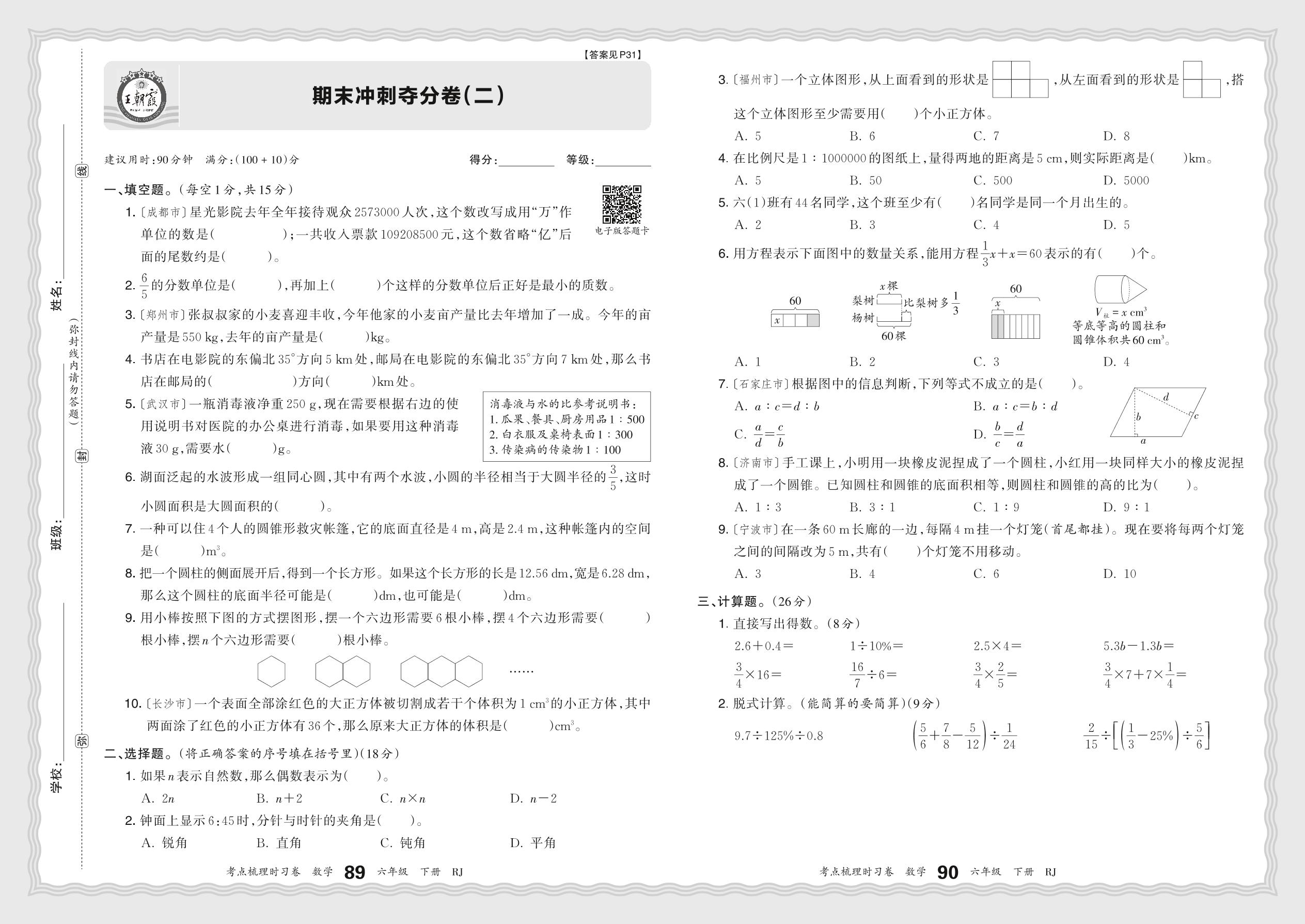 2024春下册六年级数学人教版 期末冲刺夺分卷(二)