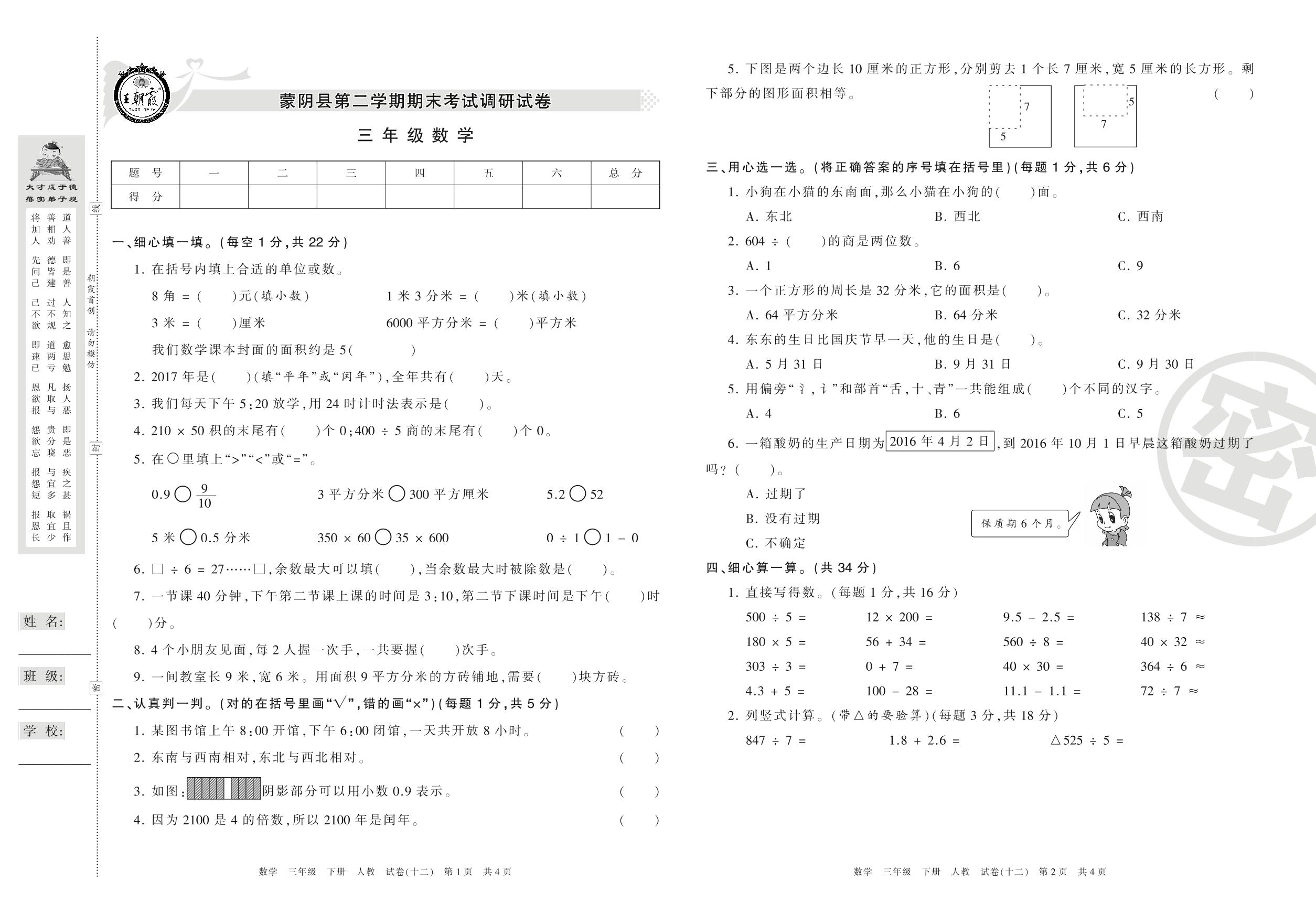 2015-2016学年第二学期临沂市蒙阴县三年级数学试卷(人教版)【12】