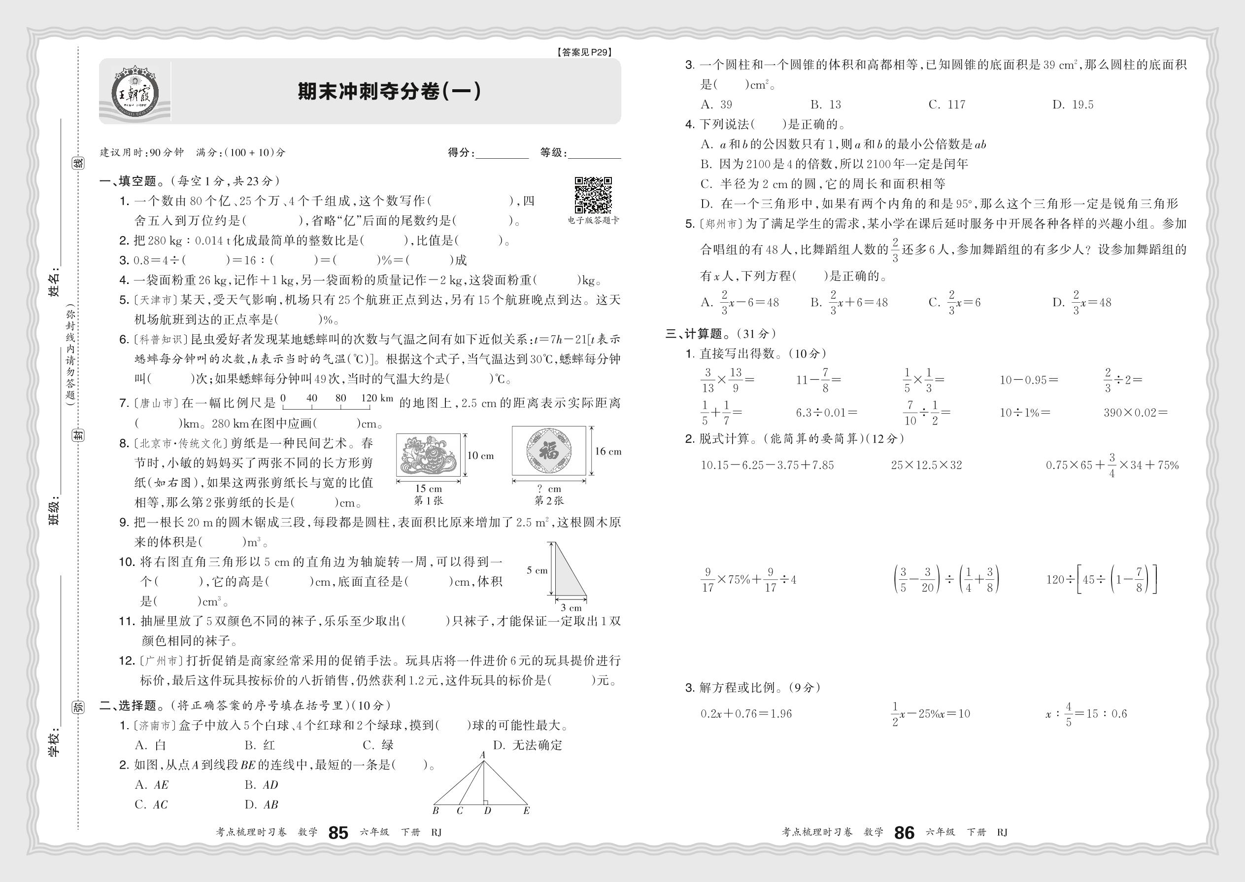 六年级数学人教版下册期末卷