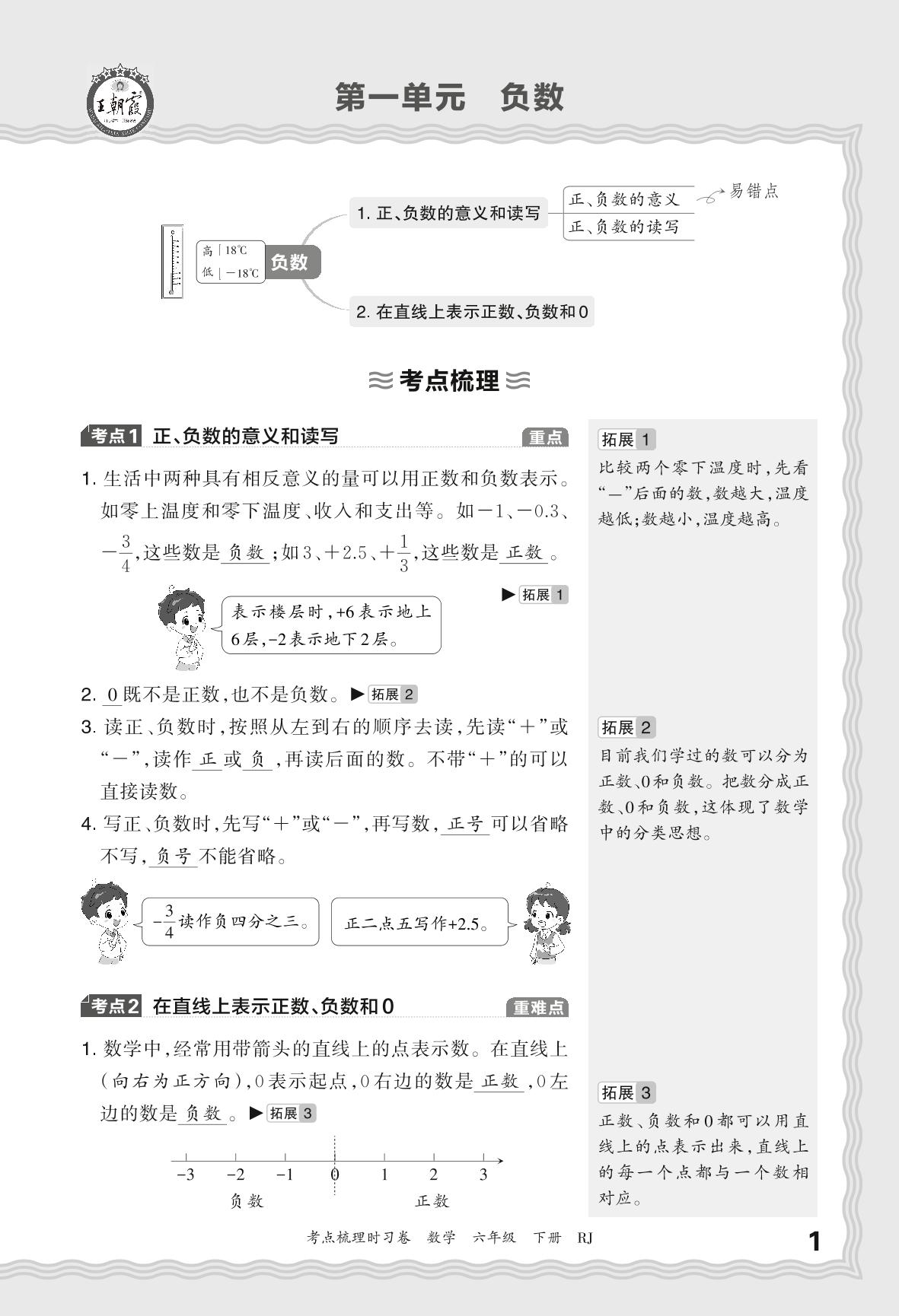 2024春下册六年级数学人教版 考点梳理手册——第一单元 负数
