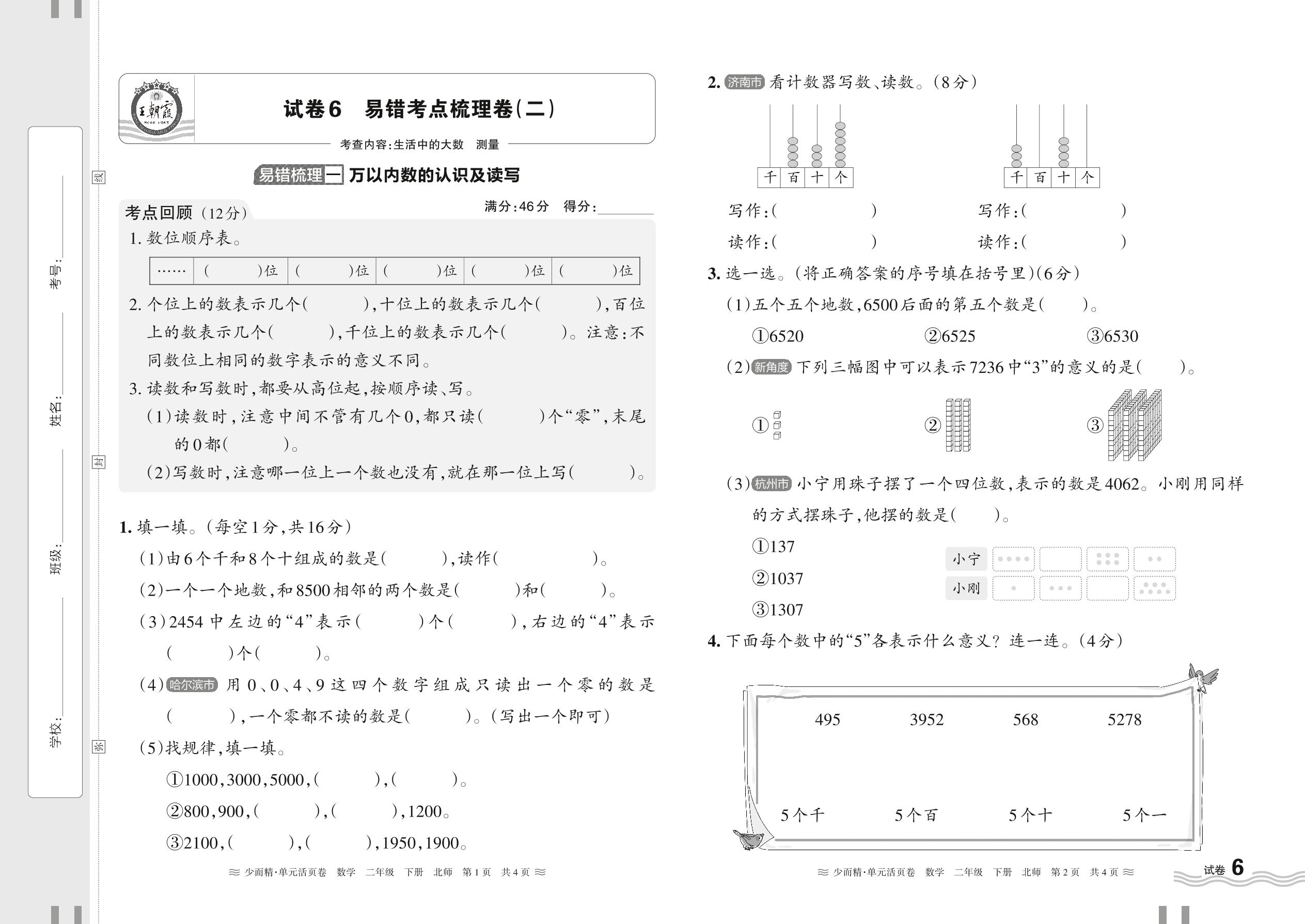 2024春下册二年级数学北师版 易错考点梳理卷——生活中的大数 测量【6】