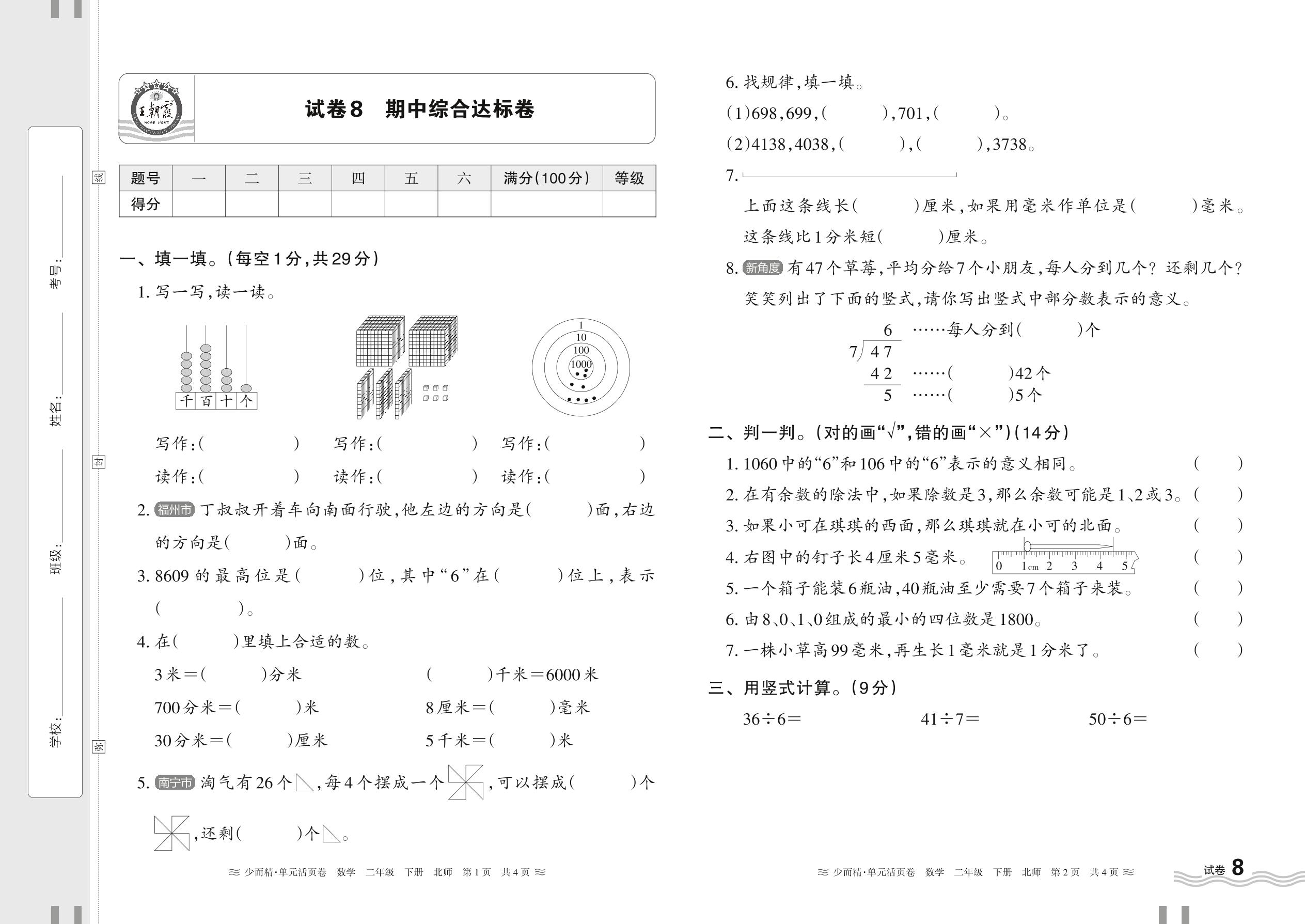2024春下册二年级数学北师版 期中综合达标卷【8】
