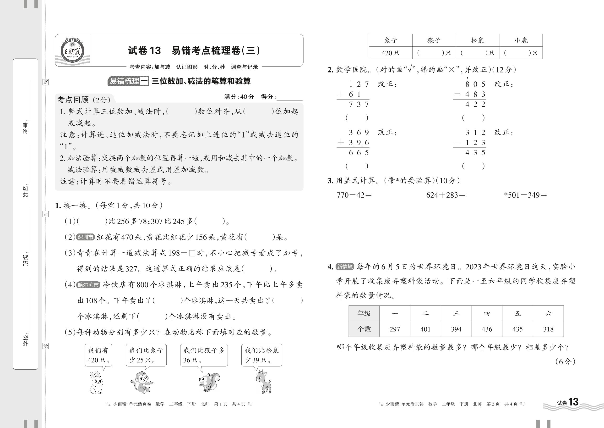2024春下册二年级数学北师版 易错考点梳理卷——加与减 认识图形 时、分、秒 调查与记录【13】