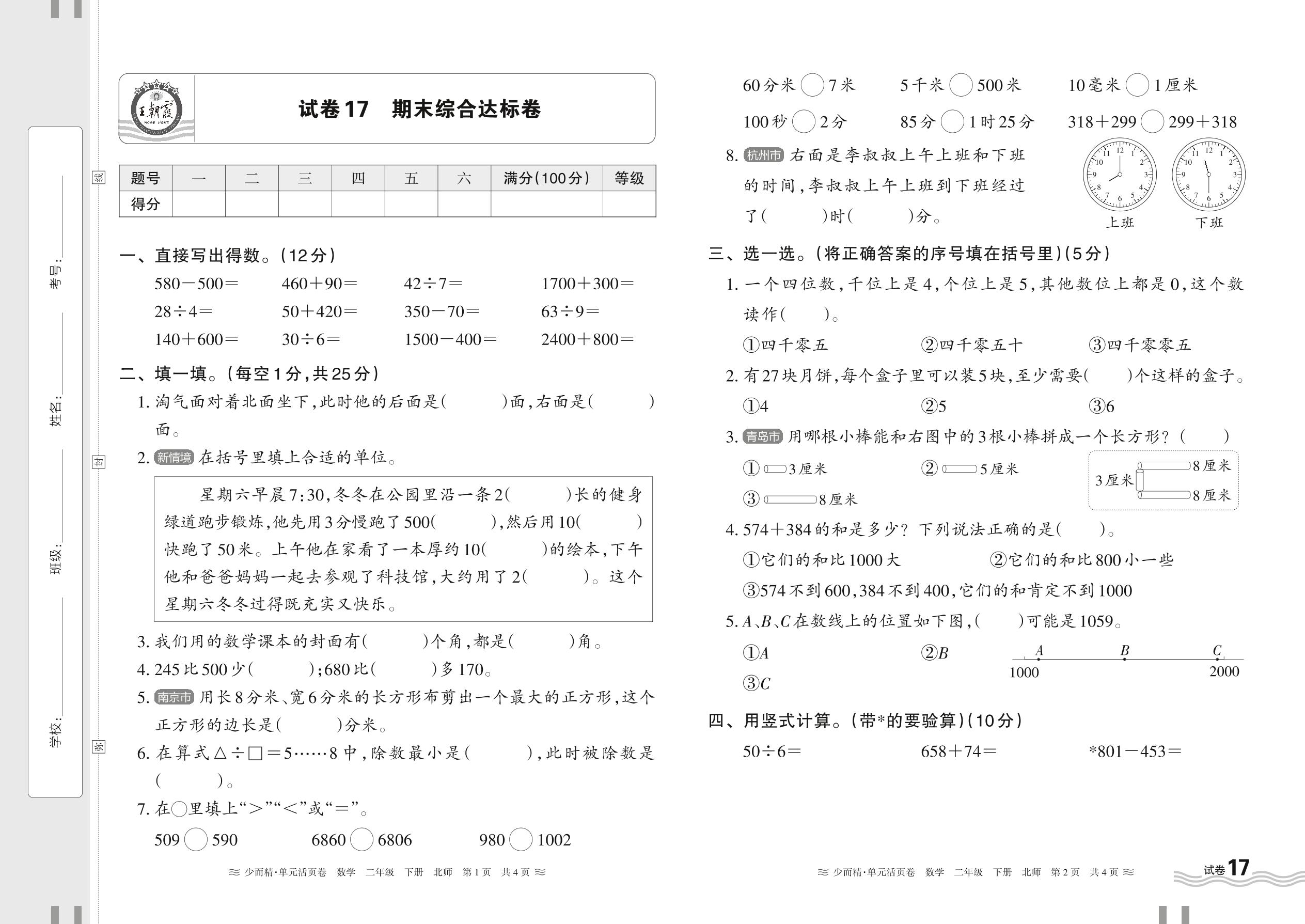 2024春下册二年级数学北师版 期末综合达标卷【17】