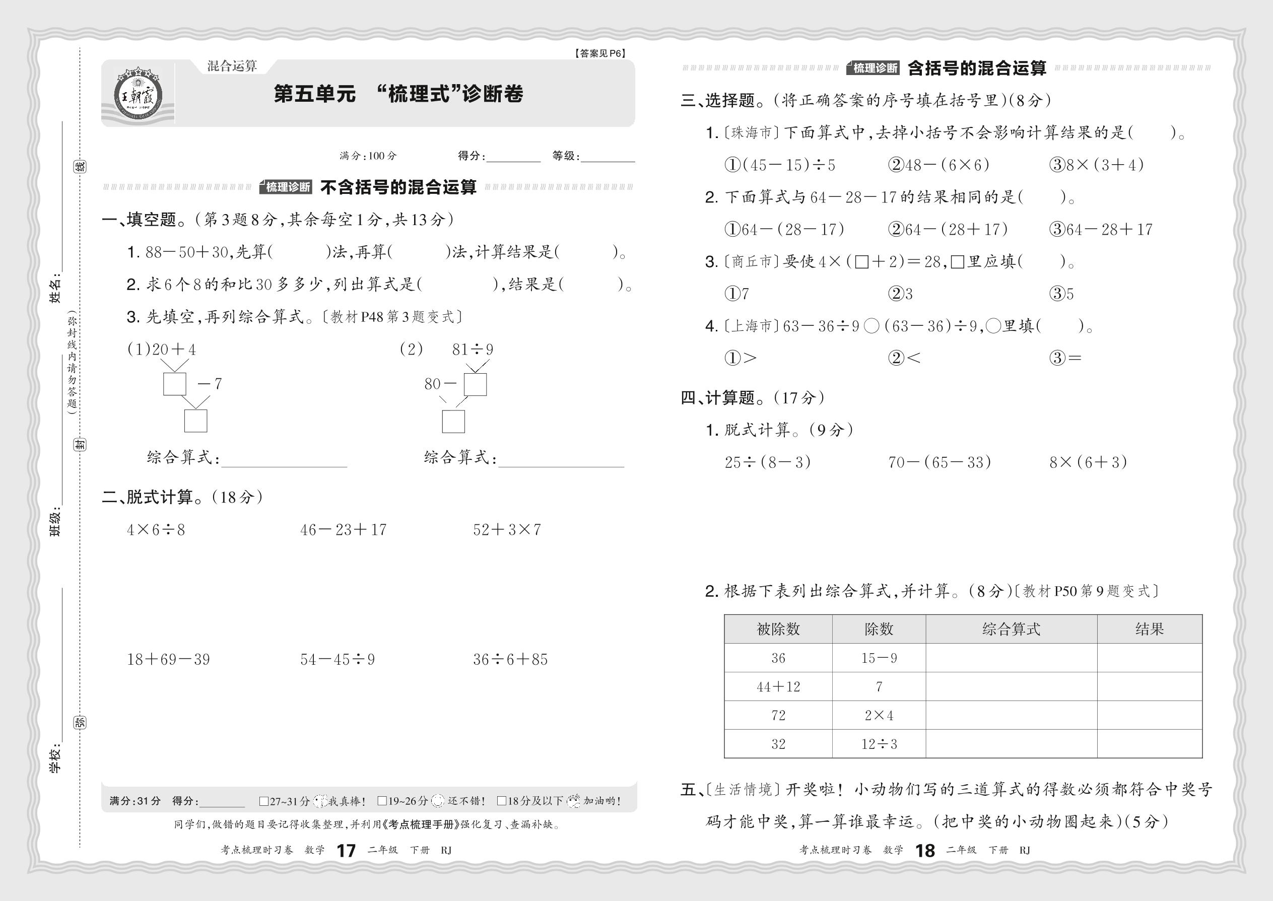 2024春下册二年级数学人教版 第五单元 “梳理式”诊断卷