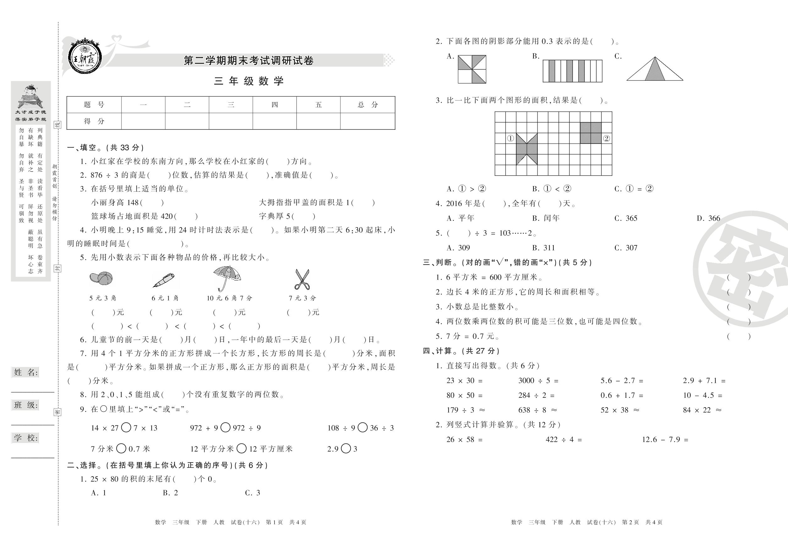 王朝霞期末调研卷三年级下册数学(人教版)【16】