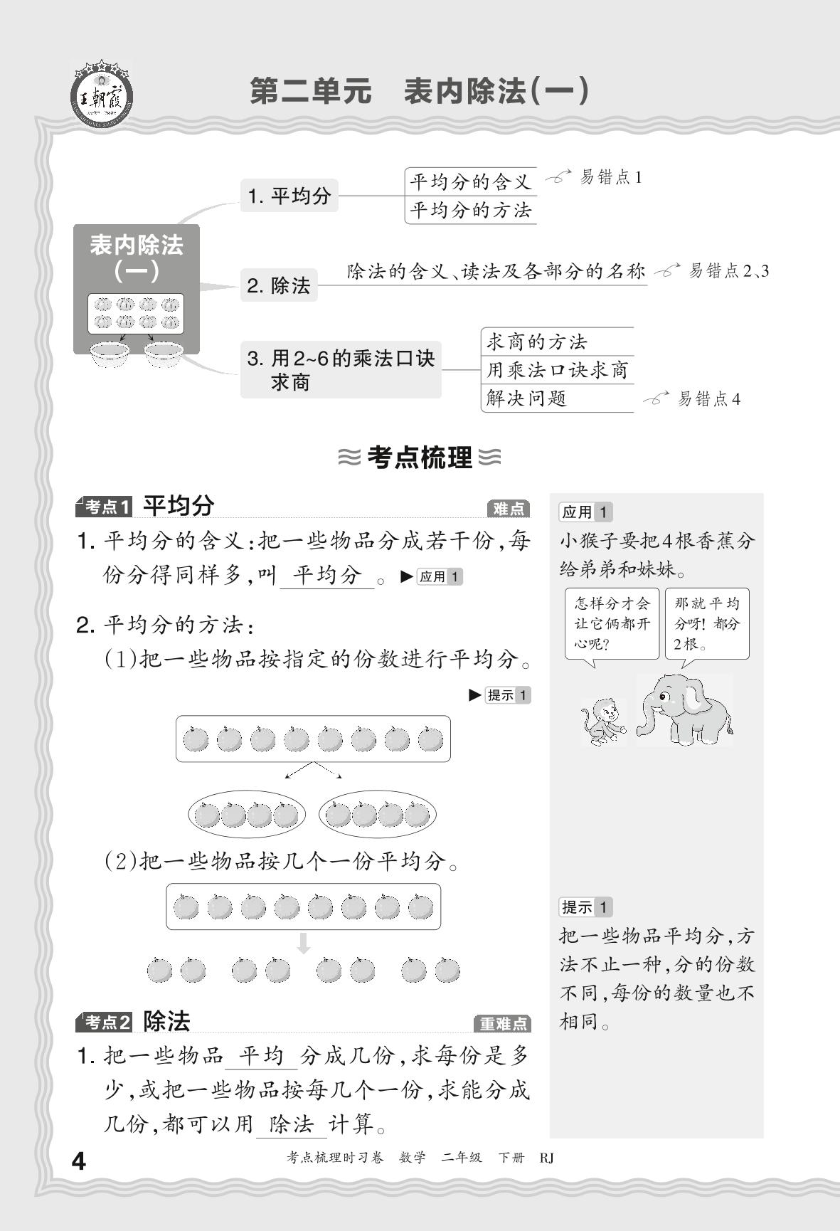 2024春下册二年级数学人教版 考点梳理手册——第二单元 表内除法(一)