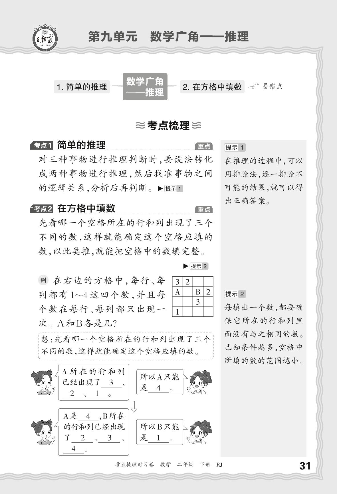 2024春下册二年级数学人教版 考点梳理手册——第九单元 数学广角 推理