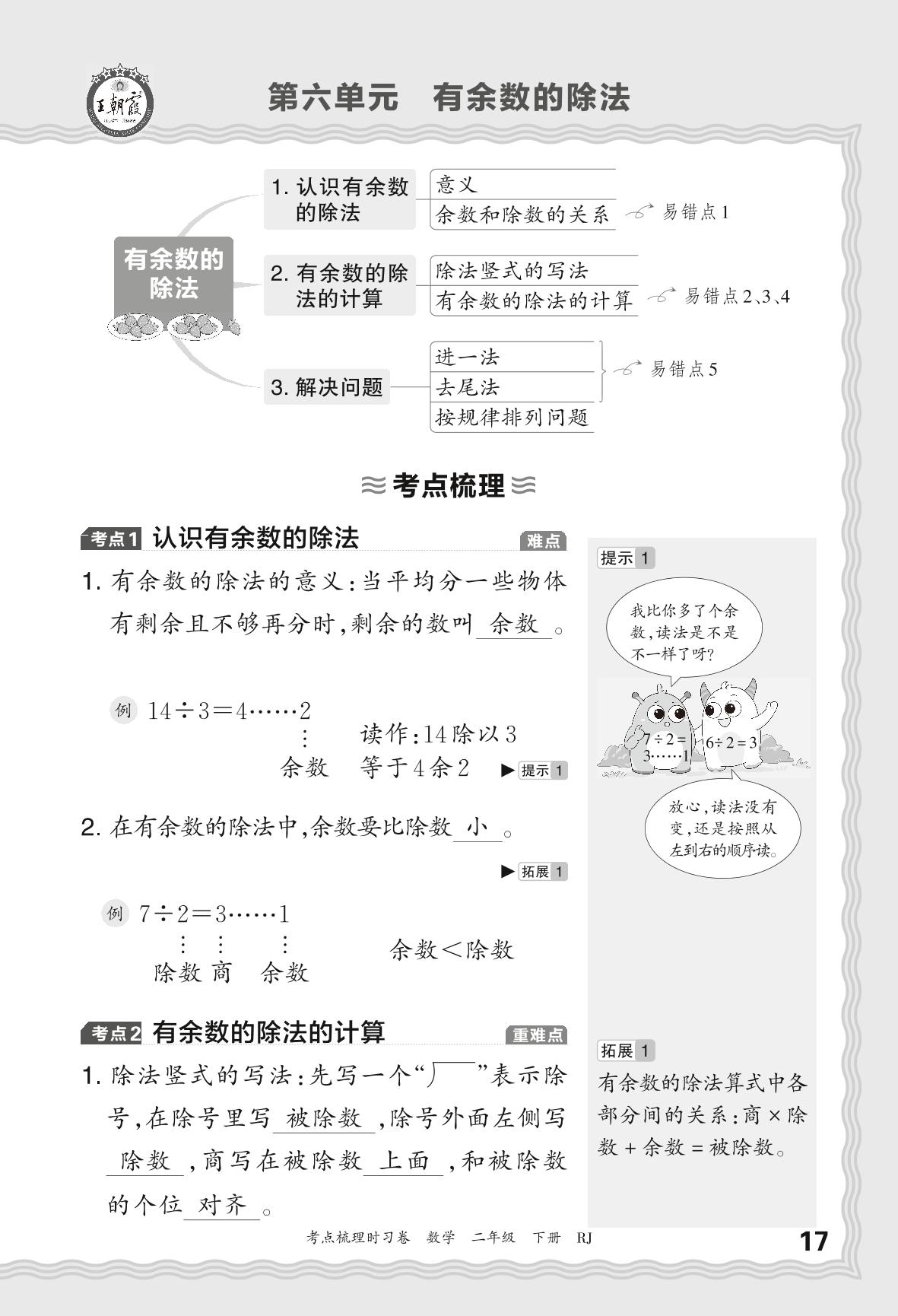 2024春下册二年级数学人教版 考点梳理手册——第六单元 有余数的除法