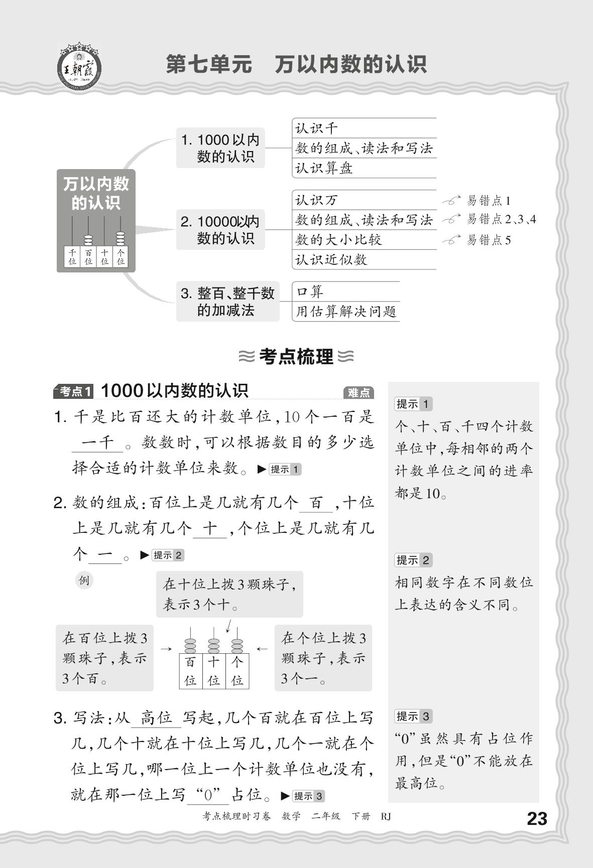 2024春下册二年级数学人教版 考点梳理手册——第七单元 万以内数的认识