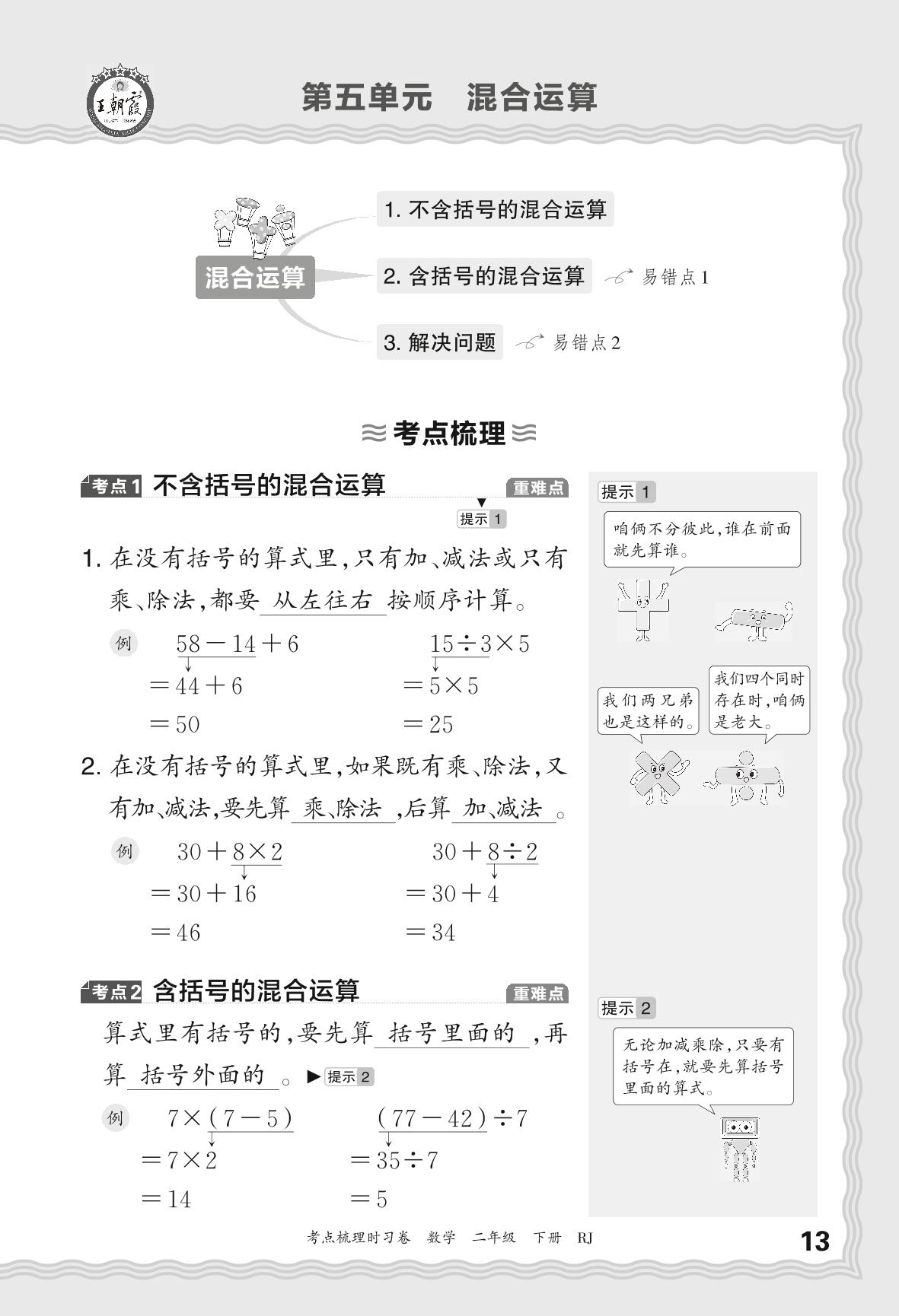 2024春下册二年级数学人教版 考点梳理手册——第五单元 混合运算