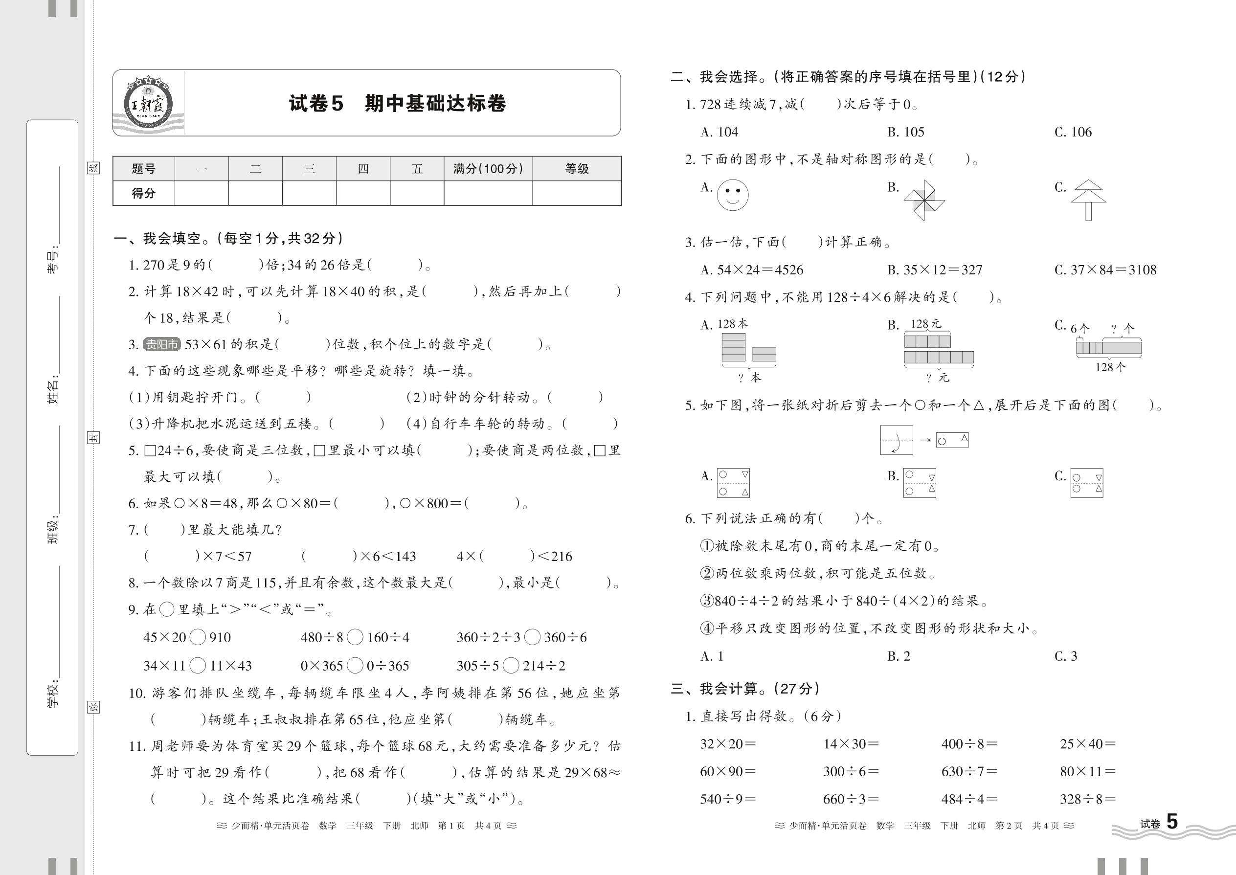 2024春下册三年级数学北师版 期中基础达标卷【5】