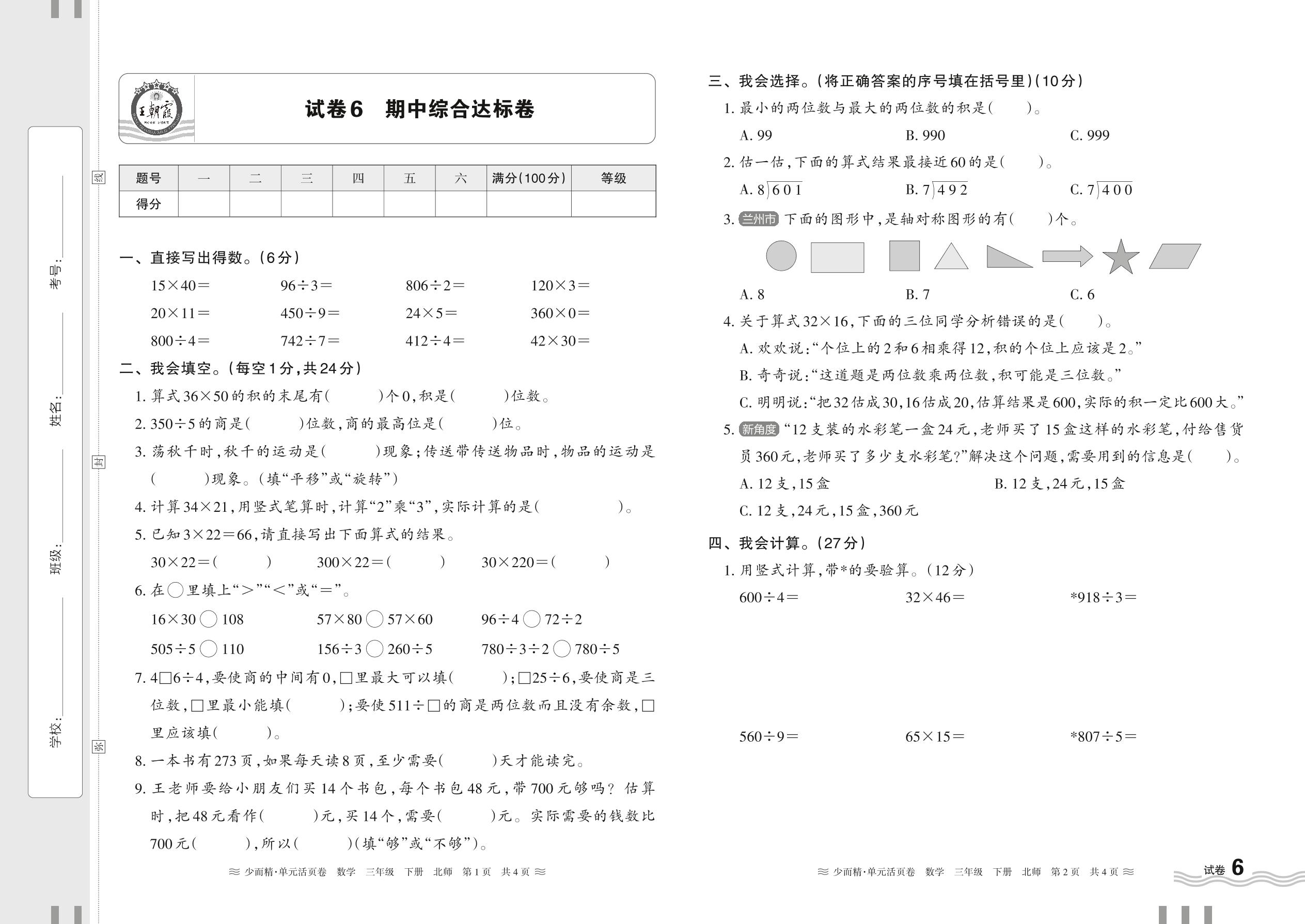 2024春下册三年级数学北师版 期中综合达标卷【6】