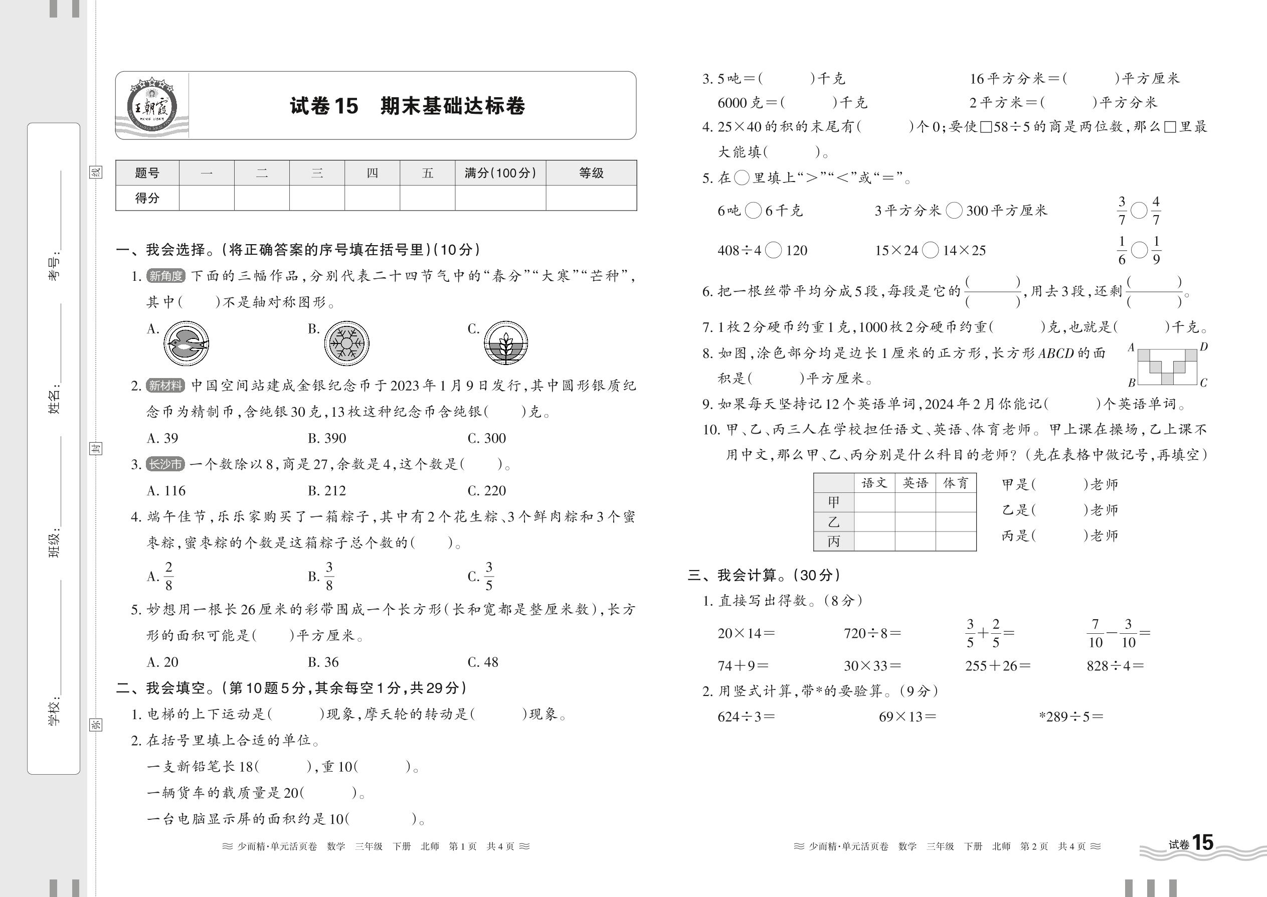 2024春下册三年级数学北师版 期末基础达标卷【15】