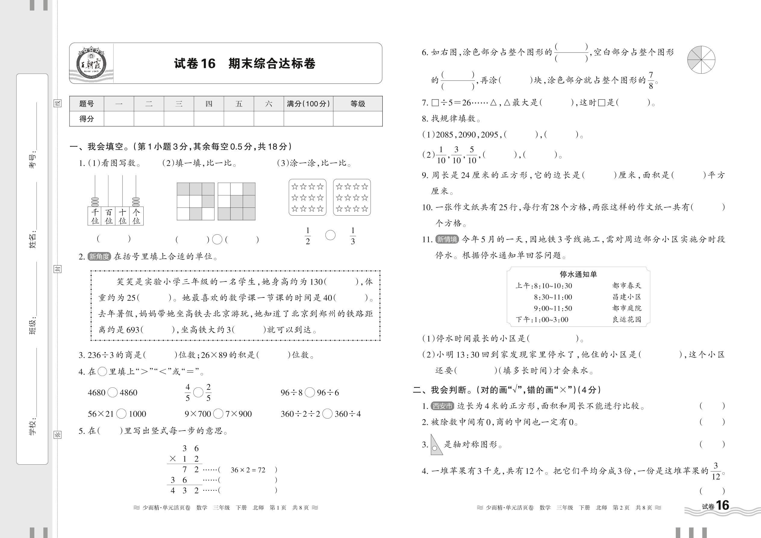 2024春下册三年级数学北师版 期末综合达标卷【16】