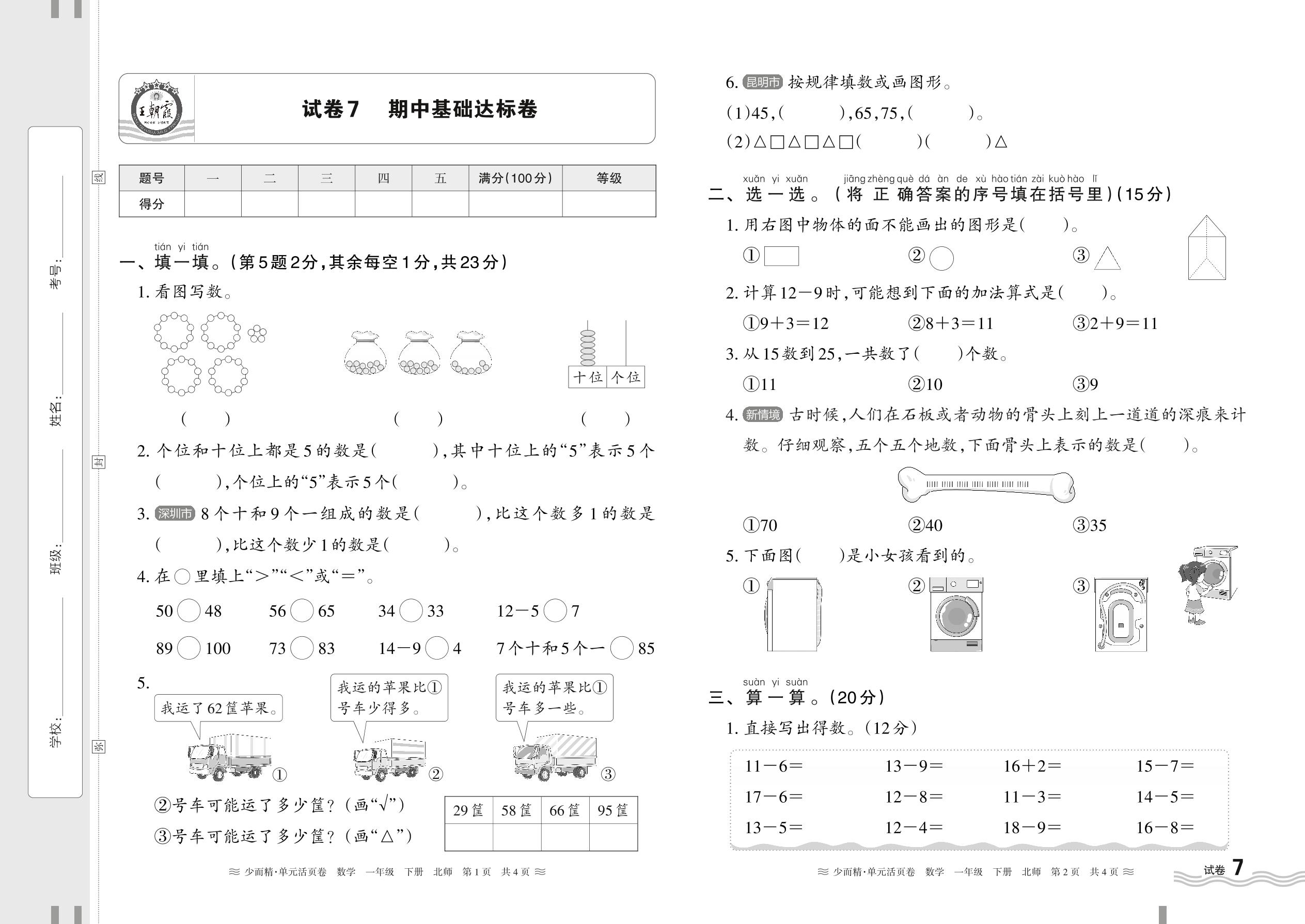 2024春下册一年级数学北师版 期中基础达标卷【7】