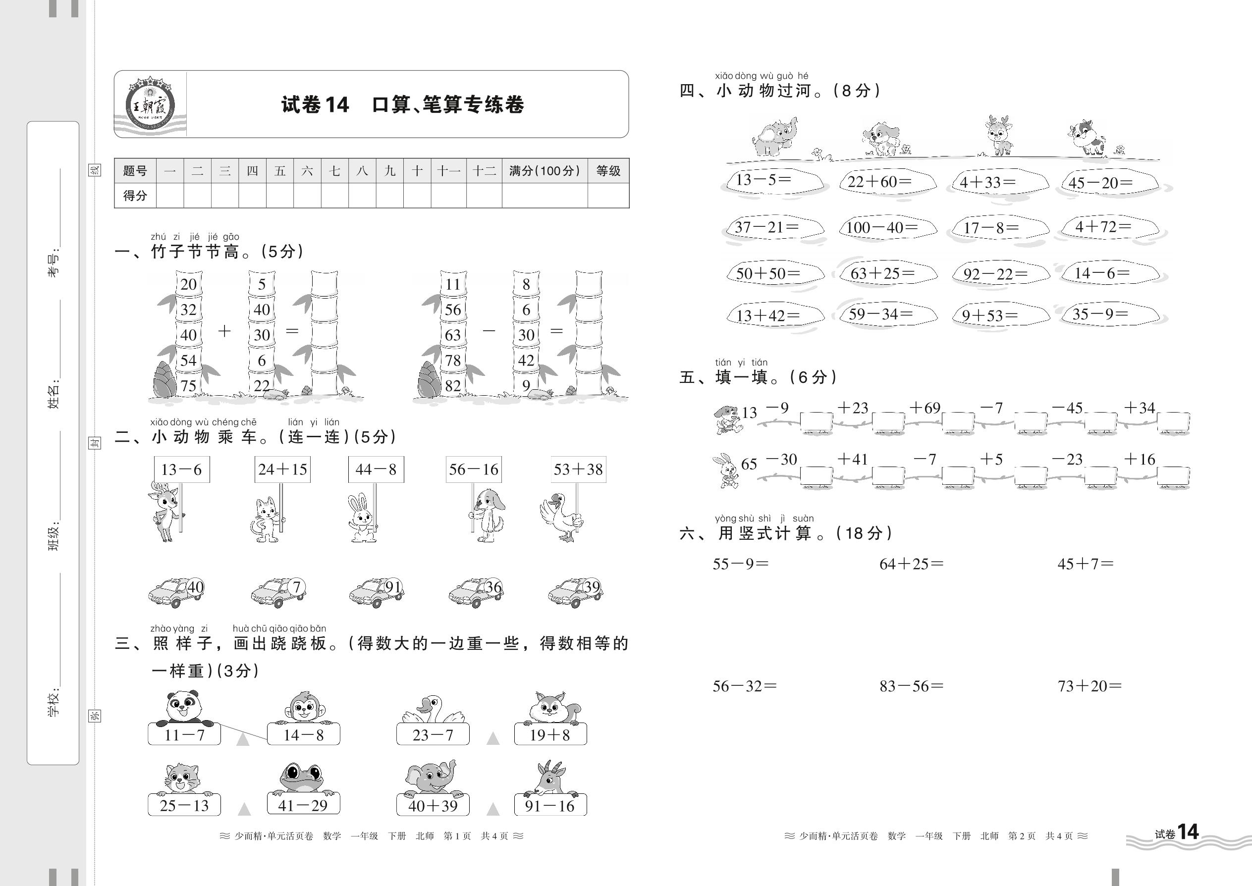 2024春下册一年级数学北师版 口算、笔算专练卷【14】