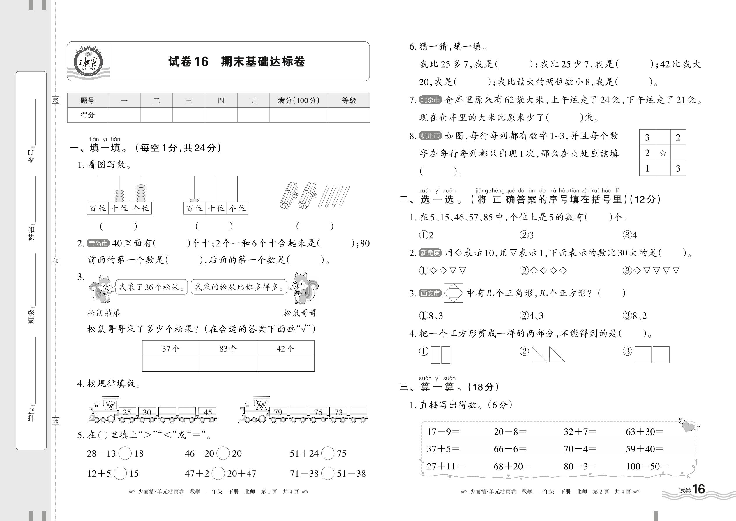 2024春下册一年级数学北师版 期末基础达标卷【16】