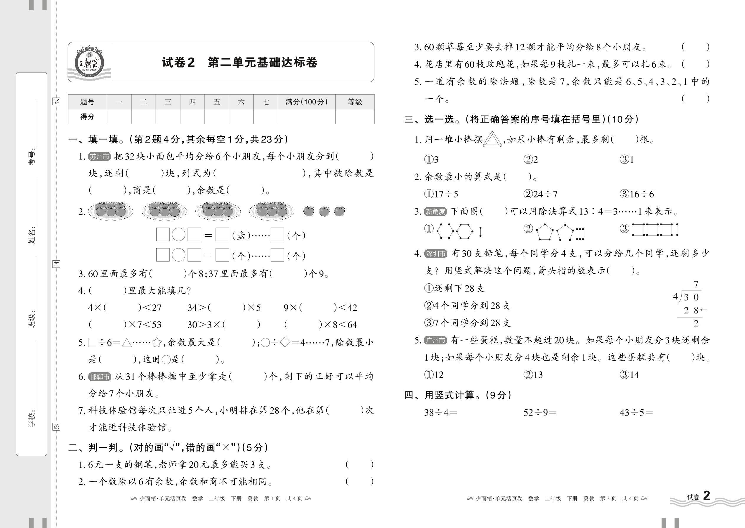 2024春下册二年级数学冀教版 第二单元基础达标卷【2】