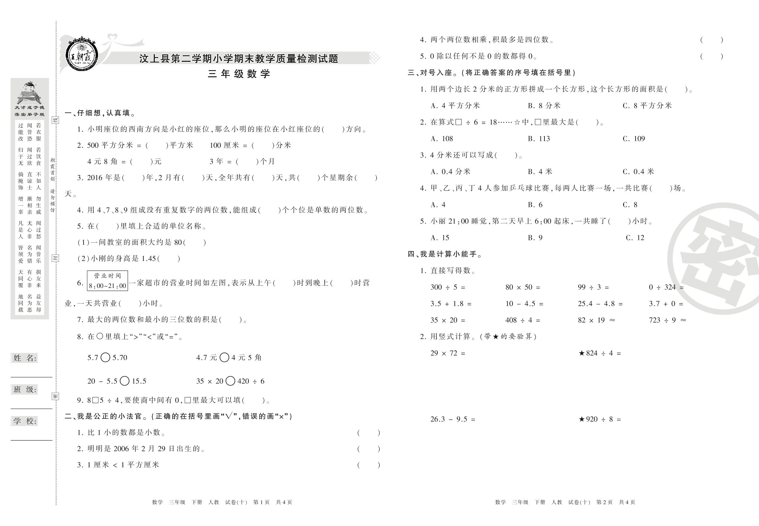 2015-2016学年第二学期济宁市汶上县三年级数学试卷(人教版)【10】